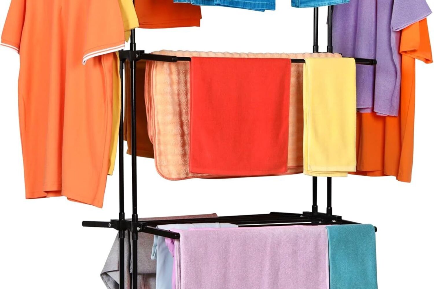 Um verdadeiro camaleão dos estendais. Este modelo vertical tem quatro níveis ajustáveis, bandejas retráteis e até asas laterais com suporte para cabides. As rodas de 360° facilitam o transporte de um lado para o outro, e a estrutura permite secar até 19 metros de roupa, tudo isto ocupando um espaço surpreendentemente pequeno. Ideal para quem vive em apartamentos.