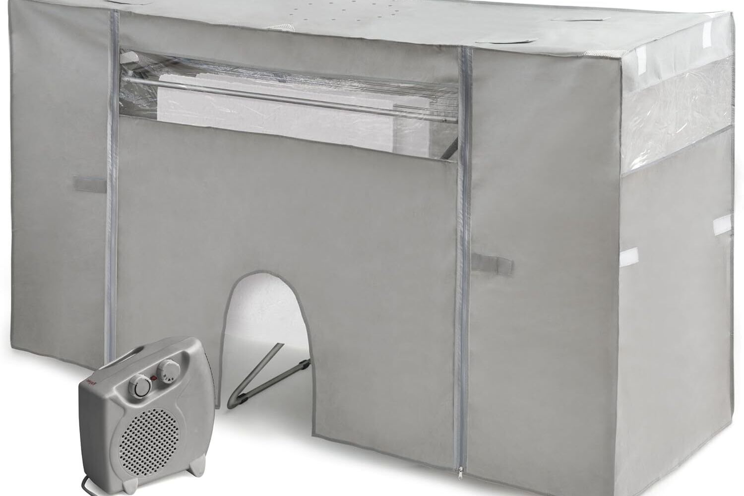 Ver PreçoUma solução engenhosa para quem quer um estendal e um secador ao mesmo tempo. A cobertura cria um ambiente fechado e quente que acelera a secagem, mesmo em espaços frios ou húmidos. É especialmente útil para casas sem varanda ou com pouca ventilação. O aquecedor e a cobertura para estendal fazem um efeito de estufa e em poucos minutos pode passar ou arrumar