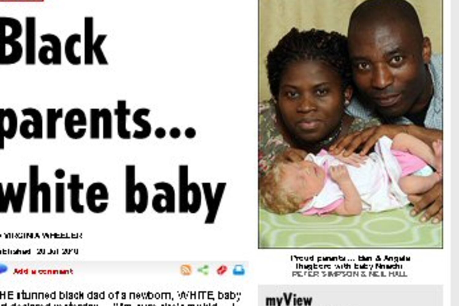 Ben e Angela, um casal britânico de origem africana, ficaram surpreendidos quando nasceu o seu terceiro filho. O espanto deve-se ao facto do novo rebento da família ser branco e ter madeixas de cabelo loiro.