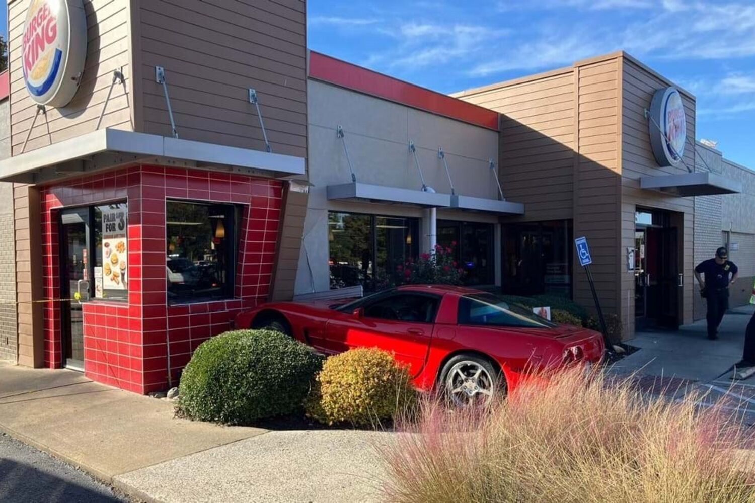 O estranho incidente aconteceu há duas semanas em Suffolk, Virgínia, quando o desportivo foi ao encontro da fachada dum restaurante da Burger King.