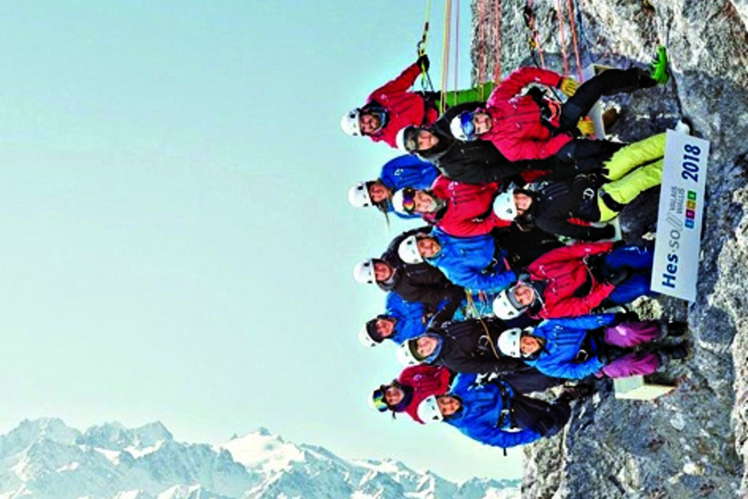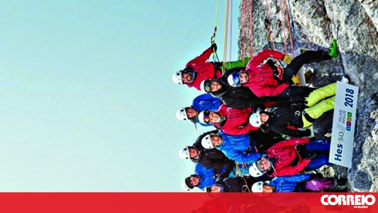 A fotografia de um grupo de 14 estudantes no topo do monte Pierre Avoi, nos Alpes, seria mais ou menos vulgar não fosse o caso de o ângulo em que se vê os jovens ser o ângulo certo. O grupo fez-se fotografar suspenso por cordas a 1400 metros de altitude. Espetacular!
