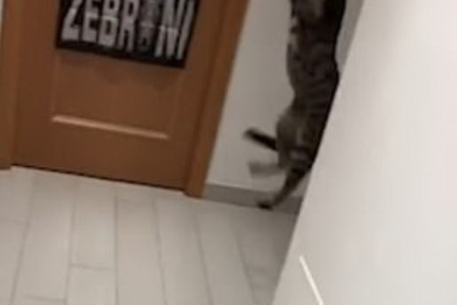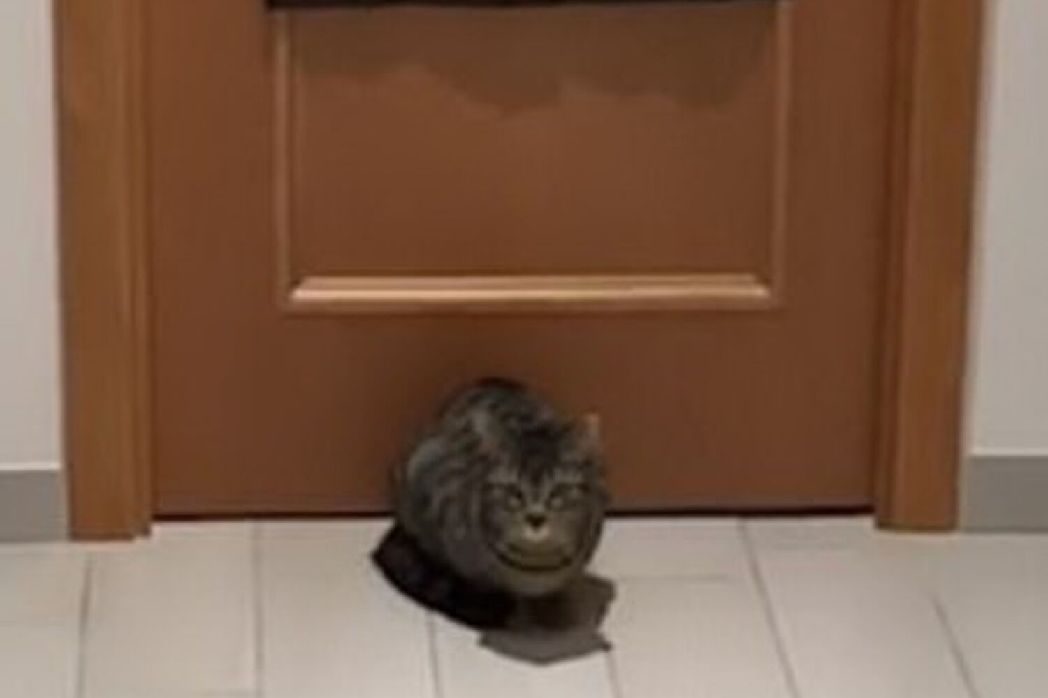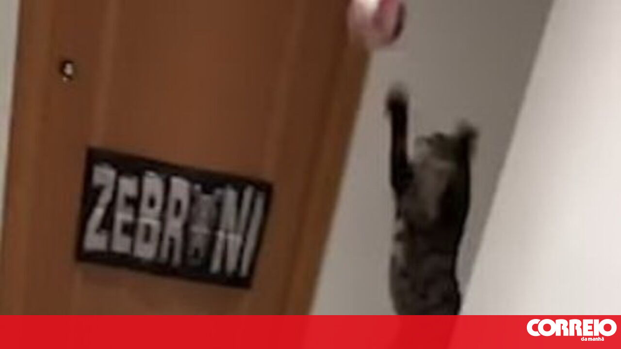 O felino salta no ar várias vezes para impedir que a bola rematada pelo dono toque na porta de madeira atrás de si e que este marque "golo".