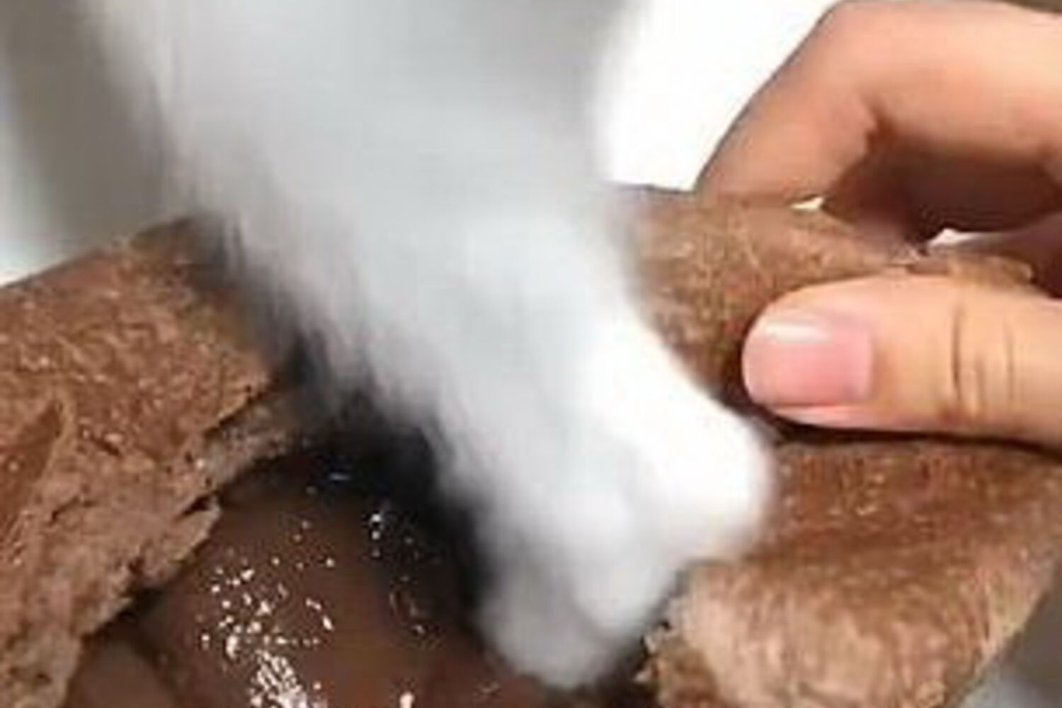 Assim que o homem abriu o bolo para mostrar o delicioso recheio de chocolate derretido, o gato lançou um ataque relâmpago... e mergulhou a pata no molho.
