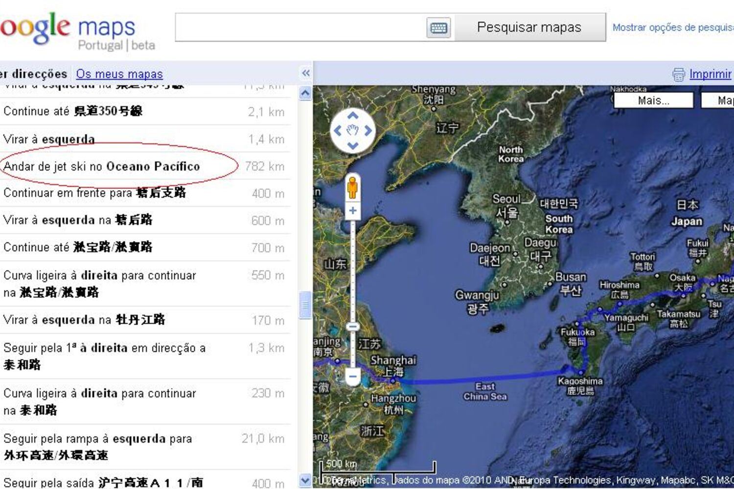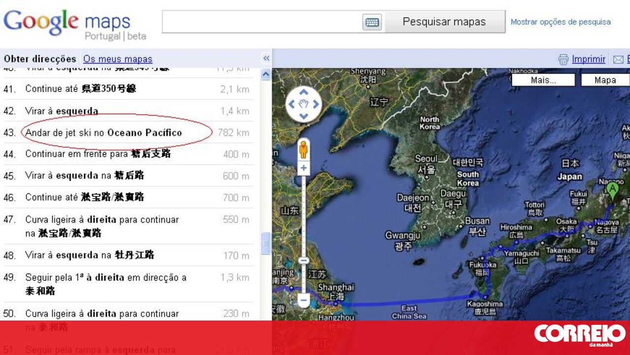 Os usuários que pedirem instruções ao serviço de mapas do Google Maps de como vão de alguma localidade do Japão para a China recebem dicas um tanto ou quanto incomuns. Na lista, com os detalhes das ruas e estradas, o site propõe ir de Jet ski para atravessar o Oceano Pacífico.