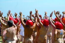 Uma mulher que posava para uma fotografia em biquíni, na praia, acabou por ser "ofuscada" por um homem, em plano de fundo do retrato que se passeava no areal.