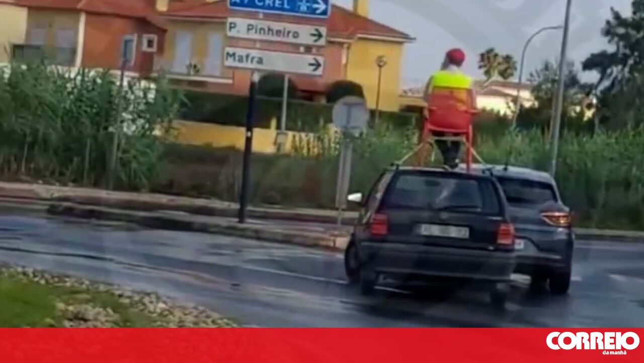 Um homem sentou-se no tejadilho do próprio carro, numa cadeira de esplanada, após se ter envolvido num acidente de viação na zona de Lourel, Sintra.