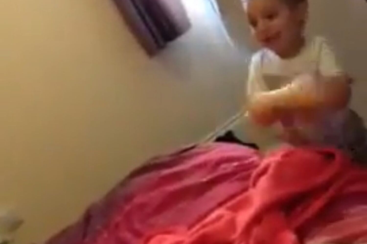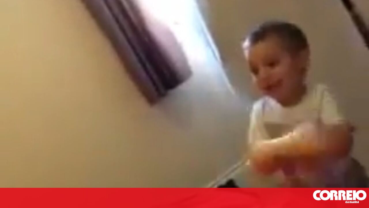 Criança descobriu brinquedo sexual e diverte-se a abaná-lo.