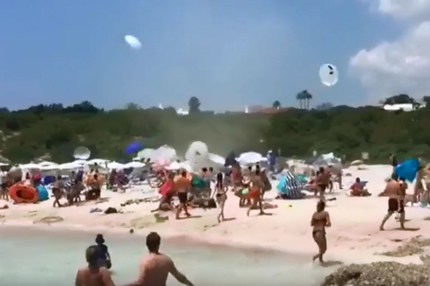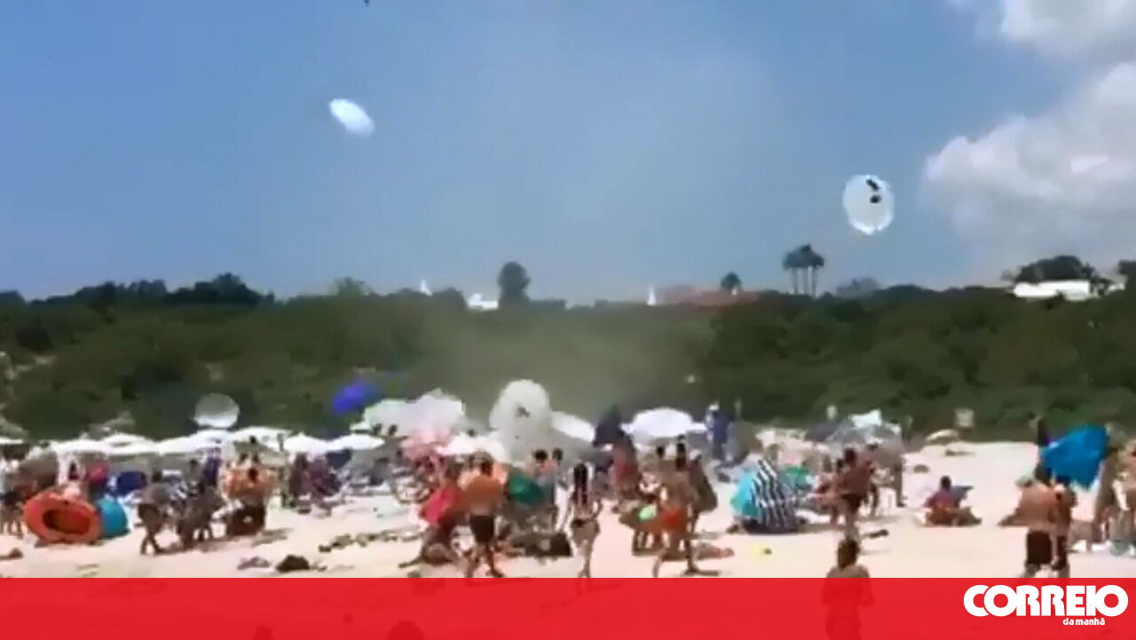 Numa praia de Menorca, em Espanha, os banhistas foram surpreendidos por um remoinho de vento que fez levantar dezenas de guarda-sóis. Ainda houve quem tentasse correr atrás do seu mas o vento não deu tréguas.