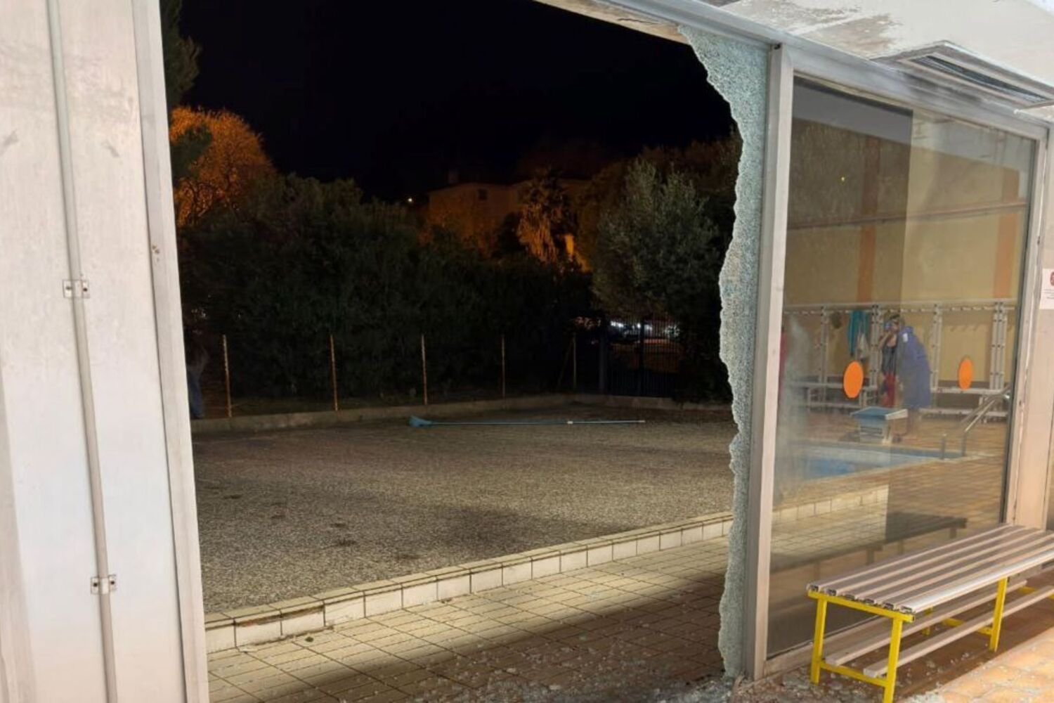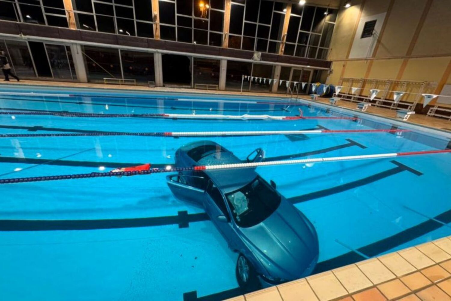 Numa questão de segundos, o carro transformou-se num projéctil incontrolável ao atravessar a cerca do parqueamento e a fachada envidraçada do edifício para depois mergulhar para dentro da piscina.