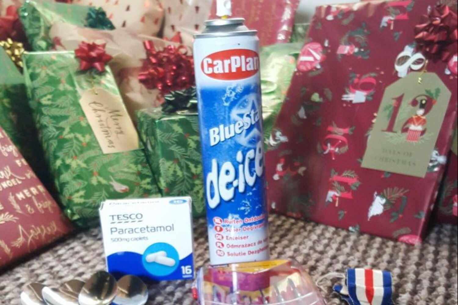 Todos os anos Sam pode contar encontrar debaixo da árvore de Natal ofertas como sacos do lixo, produtos de limpeza (detergentes e luvas de borracha), ferramentas, colheres de chá e uma caixa de paracetamol.
