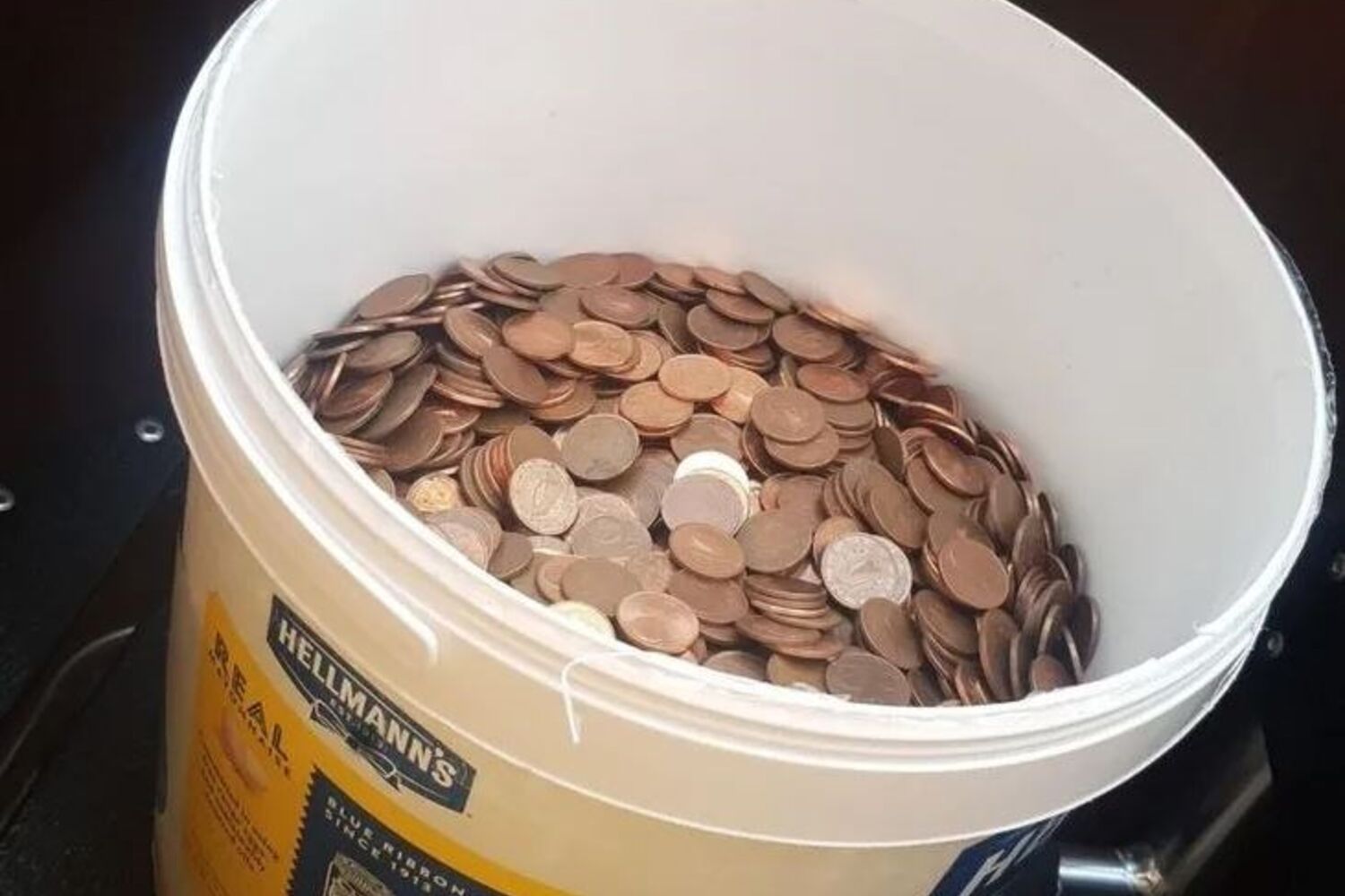Farto de ser pressionado, o antigo patrão decidiu pagar e encheu um balde de maionese com 30 quilos de moedas de 5 cêntimos.