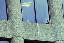 Os agentes usaram um par de vassouras para desalojar o ‘assaltante’ do seu esconderijo atrás de um estore.