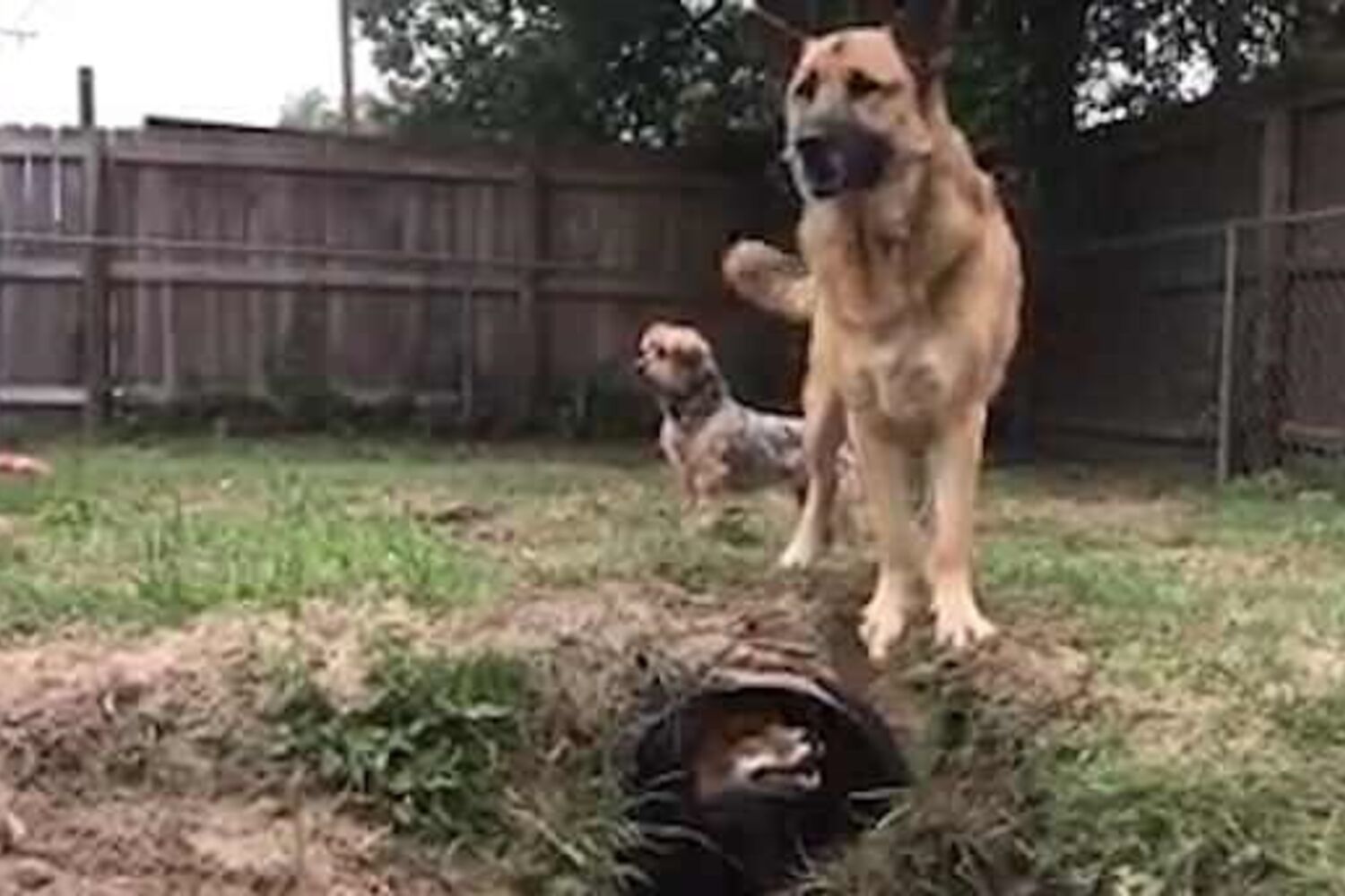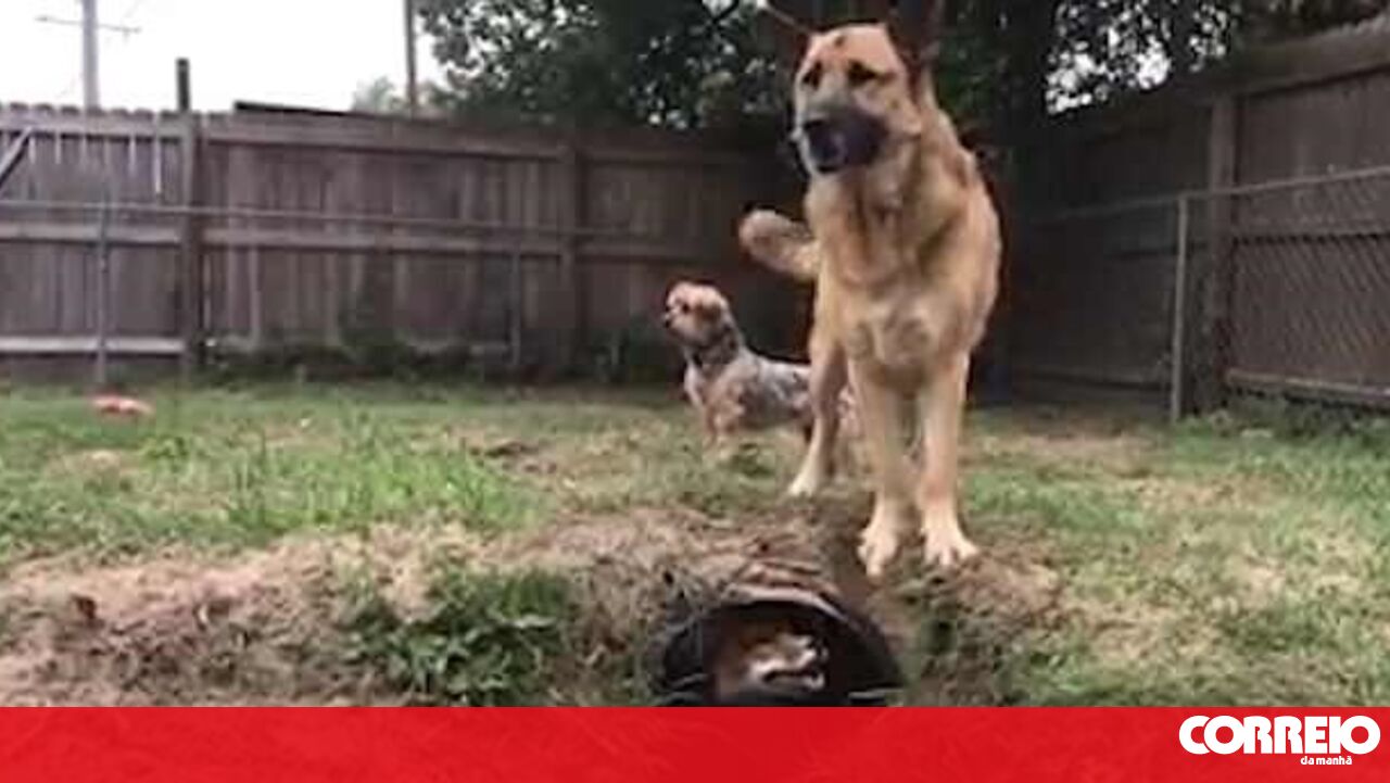 Um túnel no relvado do jardim da casa onde vivem. O cão, da raça Pastor Alemão, tenta apanhar a raposa mas não consegue entrar no esconderijo improvisado.