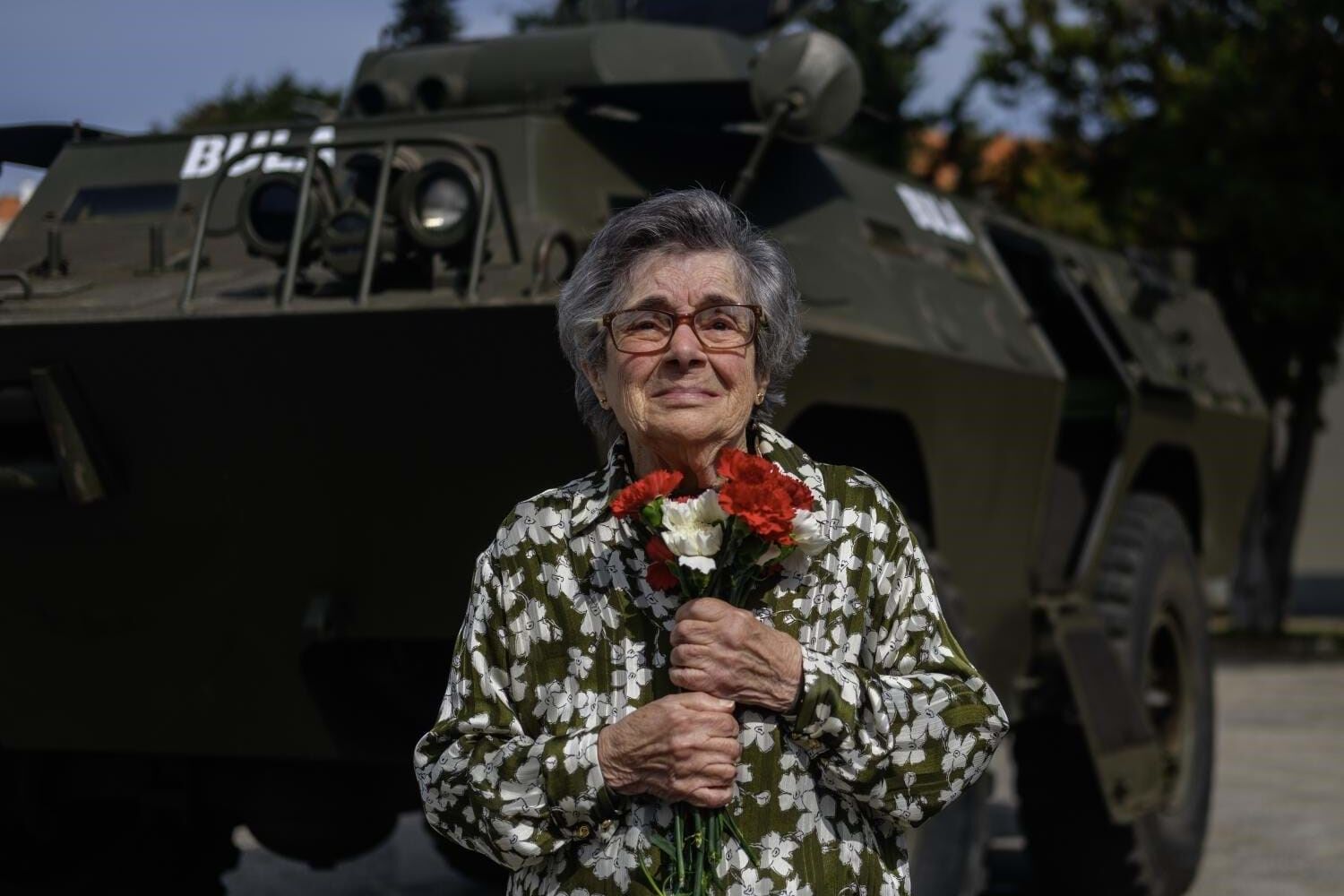 Celeste Caeiro cumpriu, a 6 de março, um desejo de meio século. Voltar a estar junto da ‘Bula’. Foi o reencontro de dois símbolos do 25 de Abril: a mulher que deu o nome à Revolução dos Cravos, por ter sido a primeira a distribuir a flor vermelha - mas também em branco, algo que muitos desconhecem - aos militares no Chiado; e a chaimite de Salgueiro Maia que tirou Marcelo Caetano do Carmo. A ‘Celeste dos Cravos’, como ficou conhecida, emocionou-se e, a dias que completar os 91 anos de idade, libertou vários "25 de Abril, sempre!" quando agora repetiu o gesto de distribuir cravos vermelhos e brancos a militares do Exército, que possibilitou o reencontro entre Celeste e a ‘Bula’.