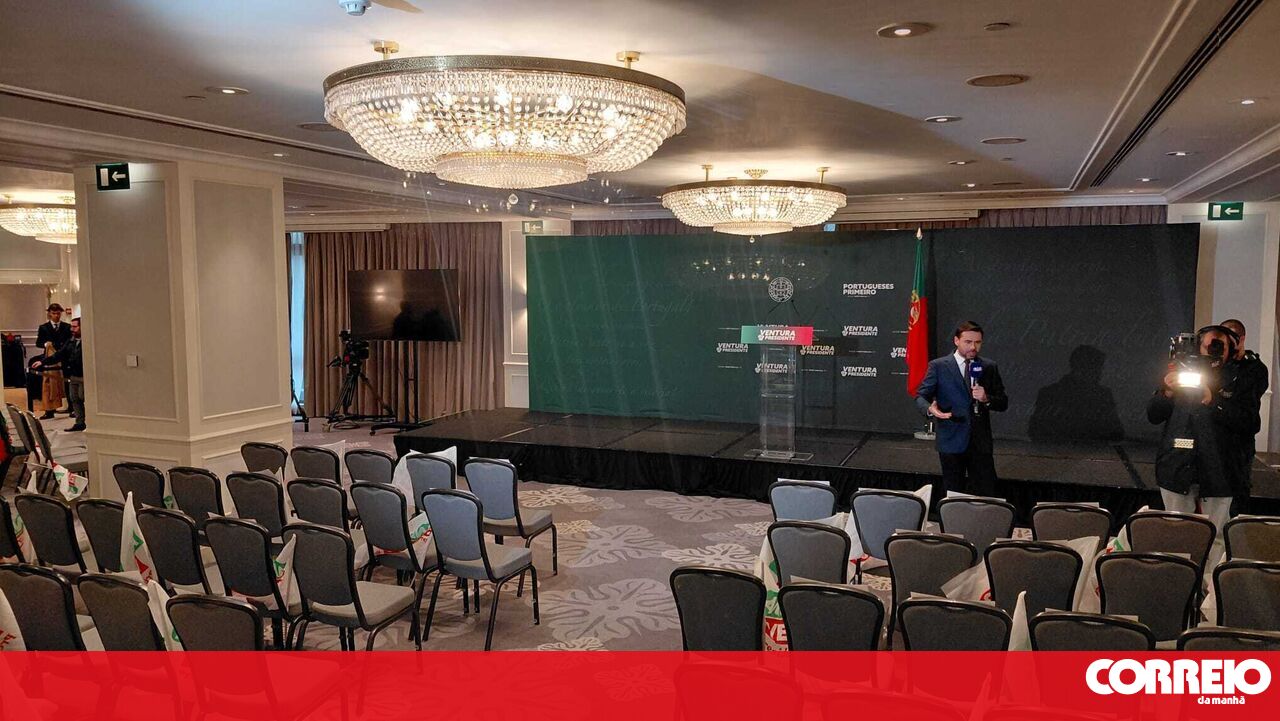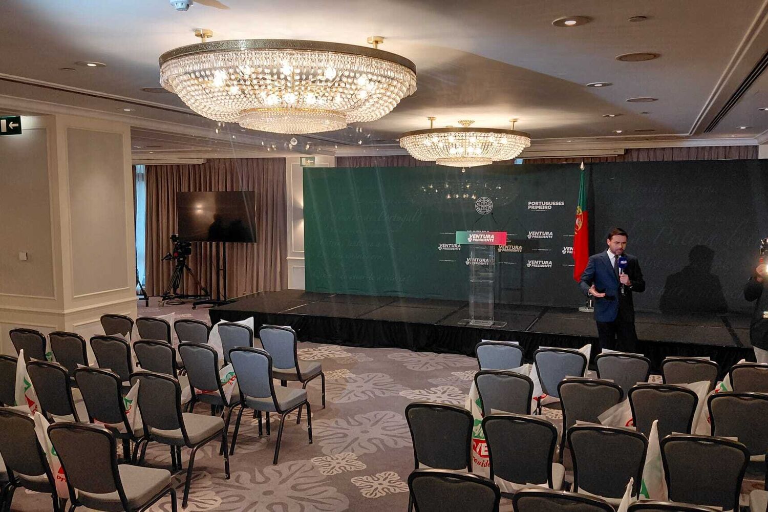 A sala do hotel Marriott, onde André Ventura irá discursar perante os seus apoiantes, está iluminada com as cores vermelha e verde, alusivas à bandeira nacional, e no painel por detrás do púlpito, verde-escuro, pode ler-se "Ventura presidente" e "Portugueses primeiro", slogans da campanha.
