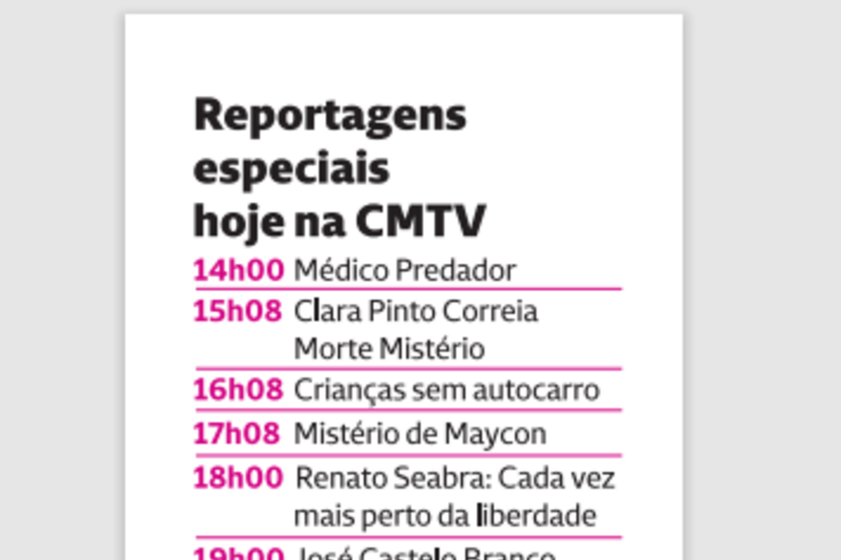 Logo às 14h00, a CMTV parte à descoberta do refúgio secreto de um médico português que foi expulso da Suécia por crimes sexuais e que agora vive no Alentejo, onde abriu uma clínica. Logo a seguir, a reconstituição dos últimos dias de Clara Pinto Correia, cuja morte continua envolta em mistério. Segue-se uma reportagem que dá voz ao sofrimento de crianças de Barrancos, que são obrigadas a percorrer mais de 100 quilómetros só para irem à escola. Um isolamento que os pais não conseguem travar. Depois, oportunidade para conhecer novos dados sobre a morte de Maycon Douglas, cujo corpo foi encontrado no mar na Nazaré.