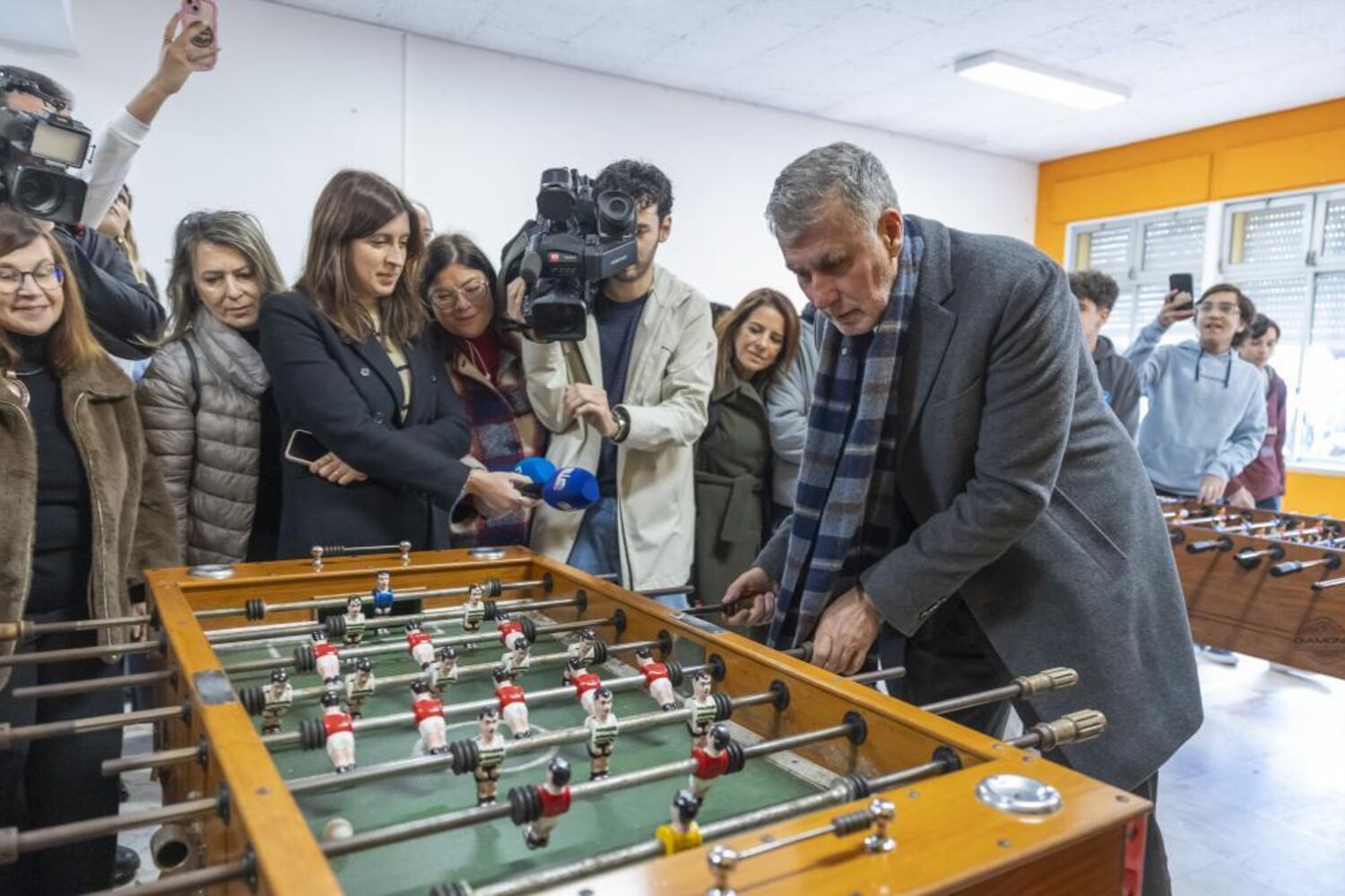 Recebido de forma efusiva pelos alunos, que o solicitaram para tirar inúmeras fotografias, Gouveia e Melo iniciou a visita no espaço de convívio da escola, onde jogou matraquilhos, alinhando pelo Benfica, contra Isaltino Morais, que defendeu o Sporting.