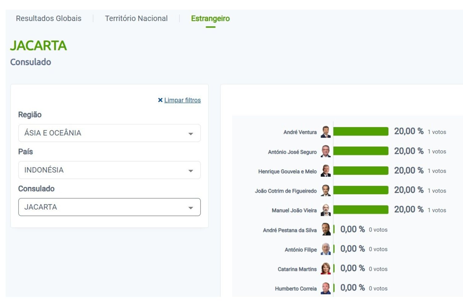 Segundo os dados no site do MAI, António José Seguro, André Ventura, João Cotrim de Figueiredo, Henrique Gouveia e Melo e o músico Manuel João Vieira colheram um voto cada, traduzindo-se numa percentagem de 20% para cada um dos candidatos.