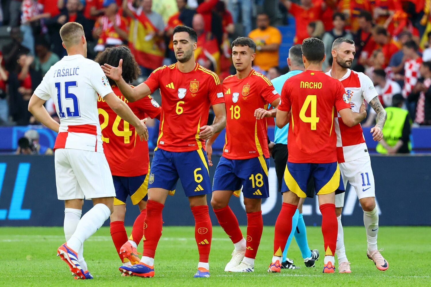 Álvaro Morata, aos 29 minutos, Fabián Ruiz, aos 32, e Dani Carvajal, aos 45+2, apontaram os tentos de 'La Roja', que persegue na Alemanha o seu quarto título europeu, depois dos conquistados em 1964, 2008 e 2012.