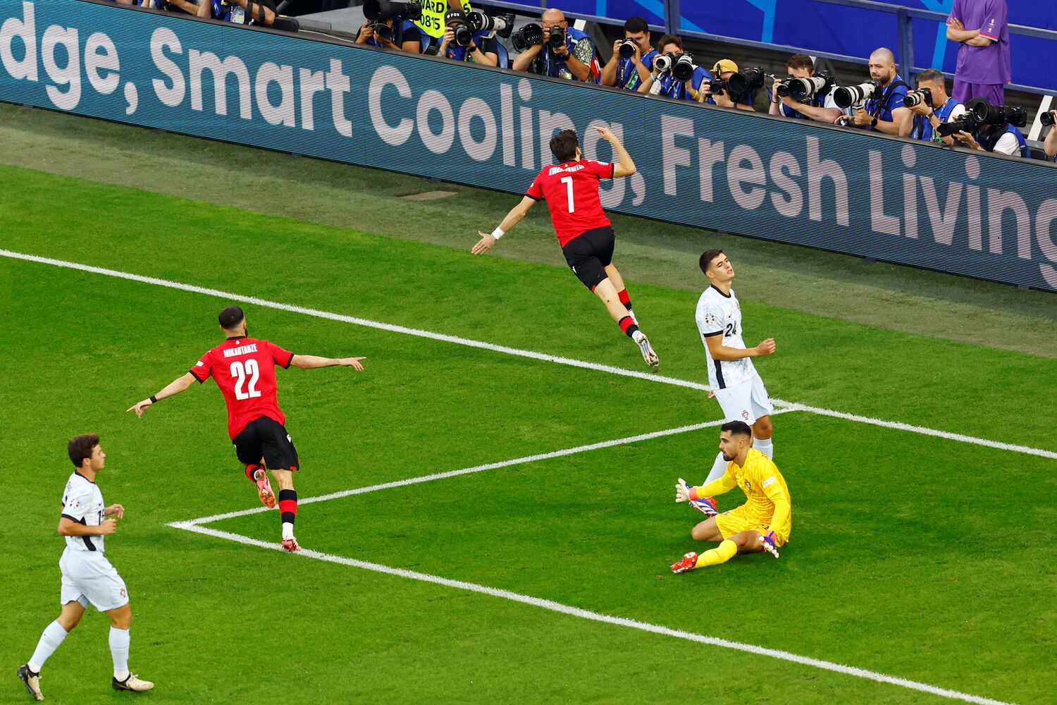 Ui ui! Kvaratskhelia quase a bisar! Passividade da defesa portuguesa e o 7 da Geórgia a surgir com espaço na área, mas a atirar fraco para defesa de Diogo Costa!
