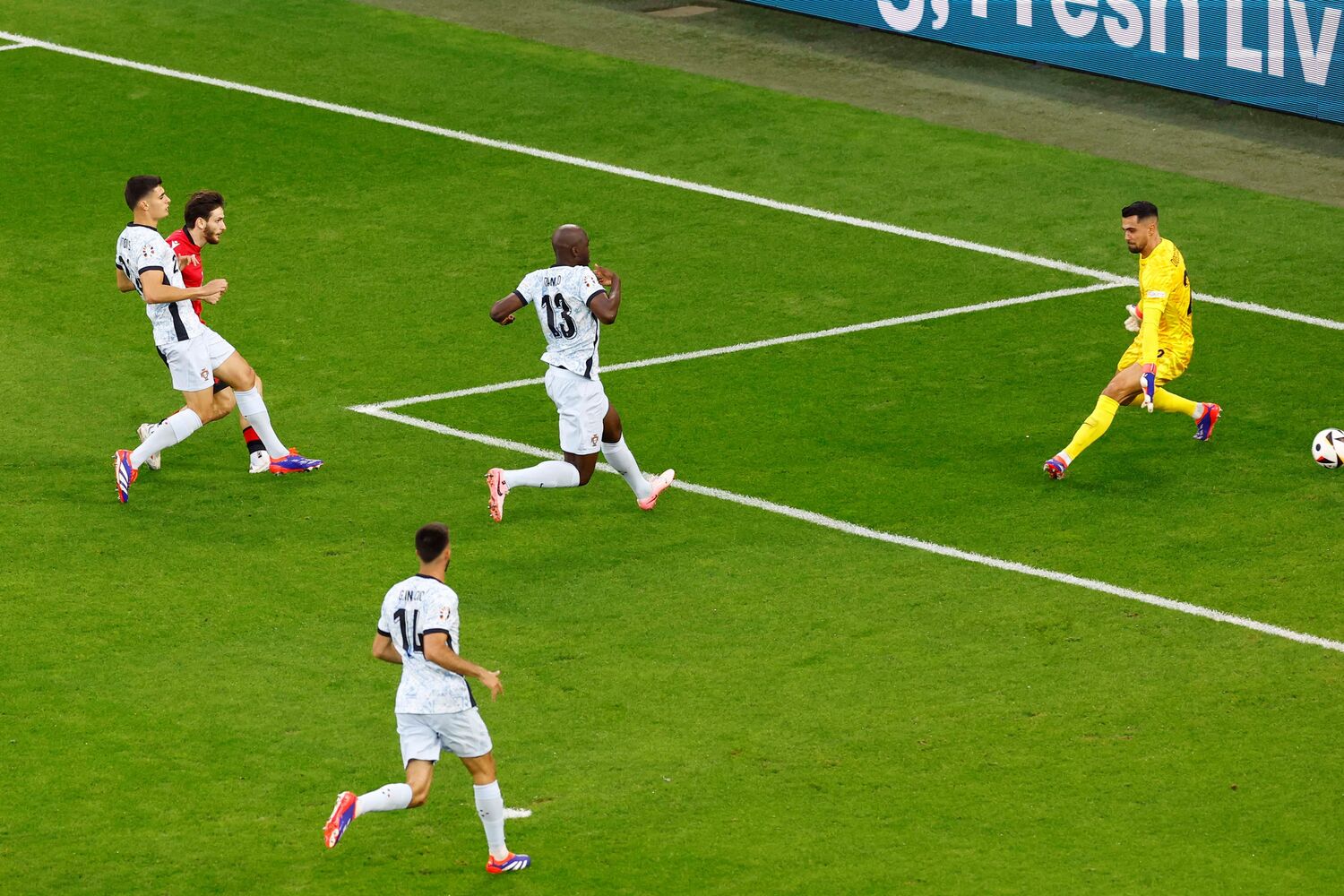 Oportunidade interceptada, Gonçalo Inácio (Portugal) de cabeça no coração da área. Assistência de António Silva de cabeça.