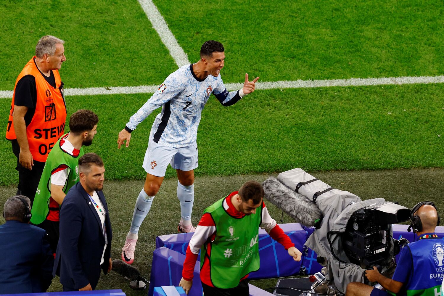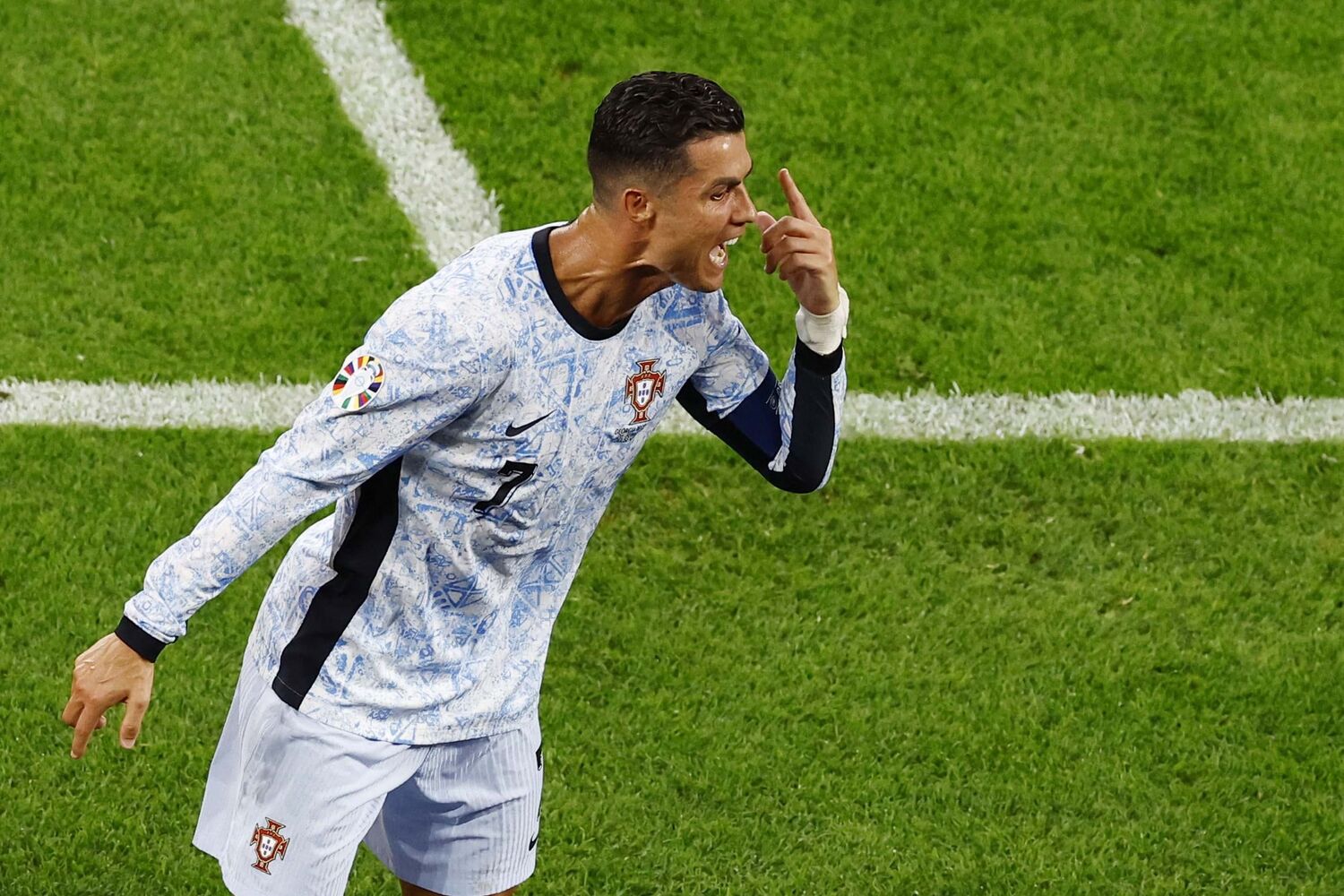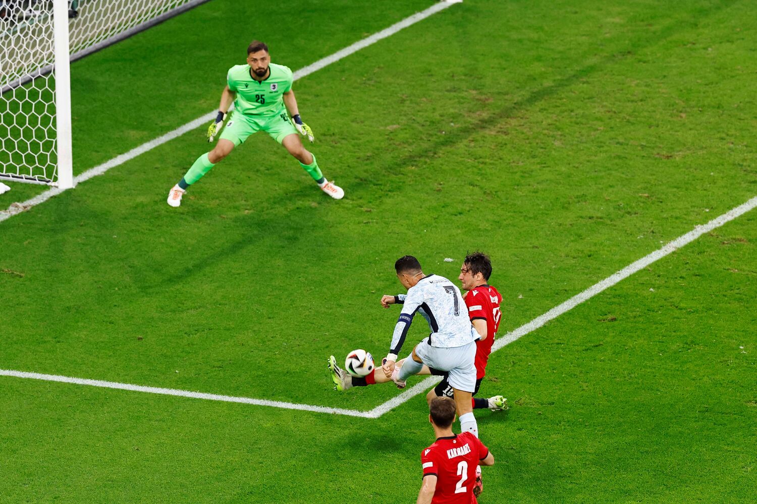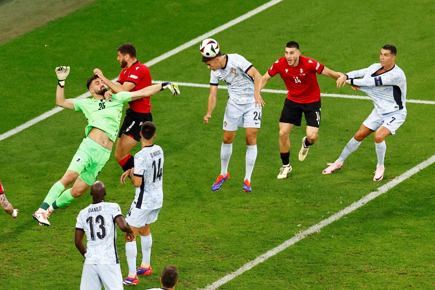 Ronaldoooo! Que perigo! Livre ‘tomahawk’ do capitão em zona frontal e Mamardashvili defende com os punhos e cede canto! A bola ia a 130 km/h, segundo a UEFA!