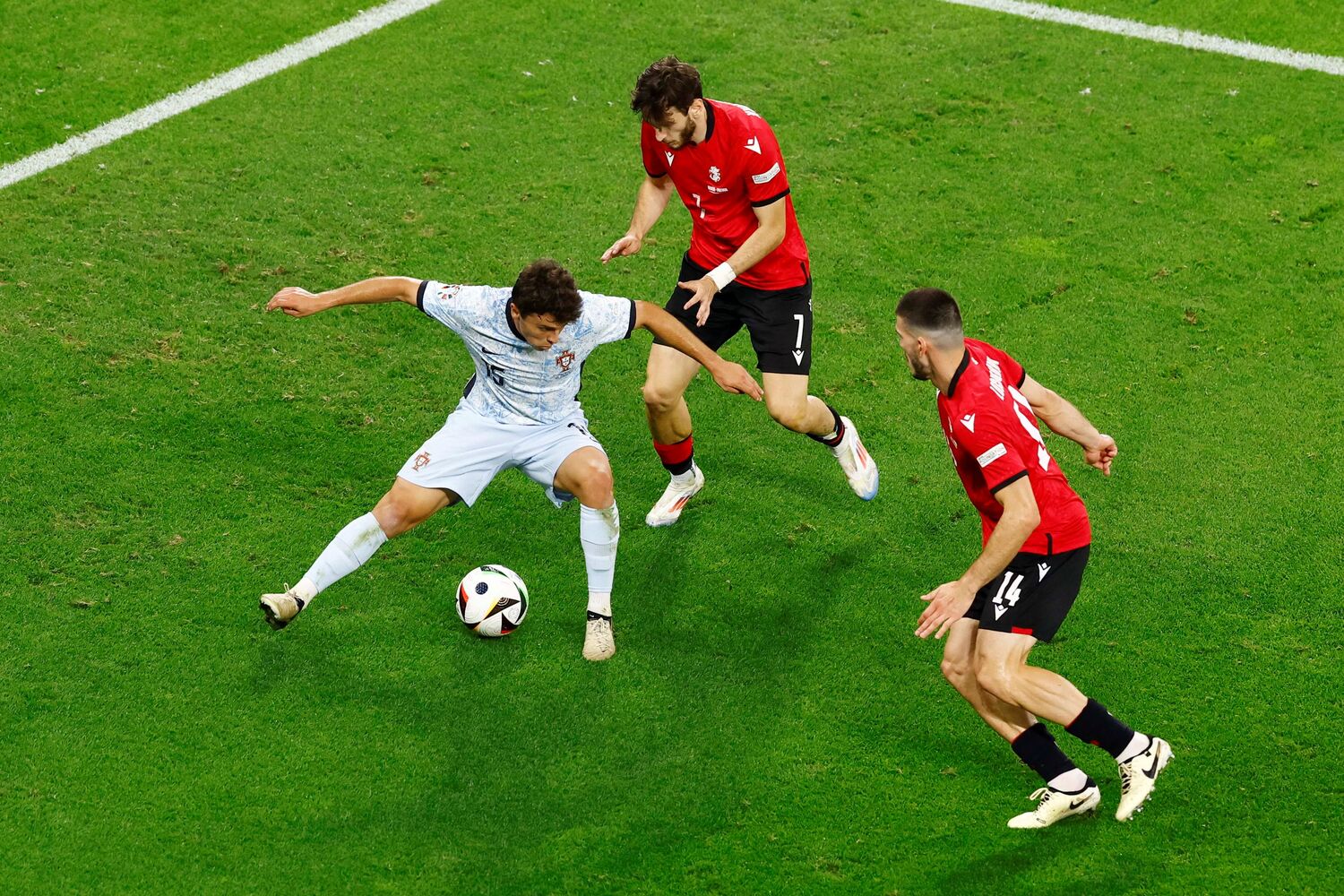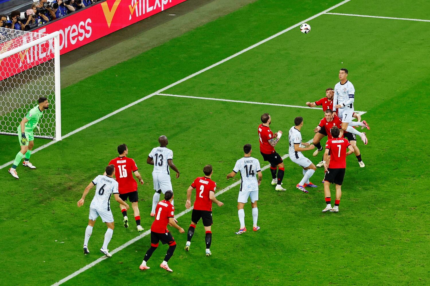 Danilo! Enorme confusão na área da Geórgia e o médio (hoje central) a desviar ao 1.º poste, mas a bola sai ao lado