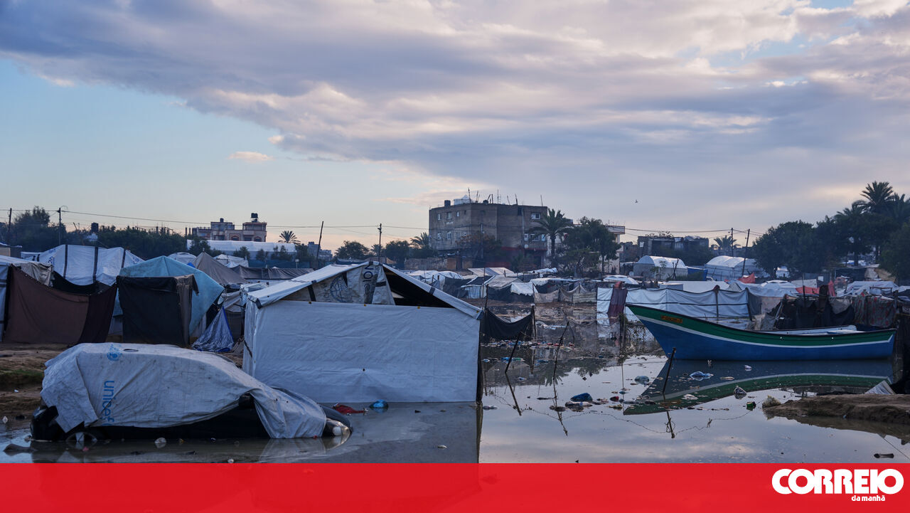 A tempestade provocou o desabamento de casas e danificou dezenas de tendas utilizadas por pessoas deslocadas pela ofensiva militar israelita após os ataques de 7 de outubro de 2023.