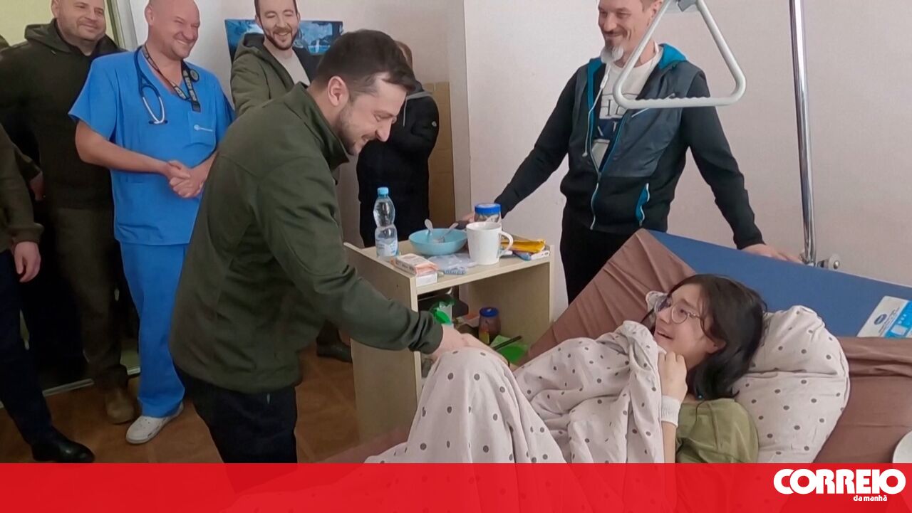 O presidente ucraniano, Volodymyr Zelensky, visitou, esta quinta-feira, um hospital de Kiev onde estão a recuperar várias vítimas dos bombardeamentos russos na cidade.