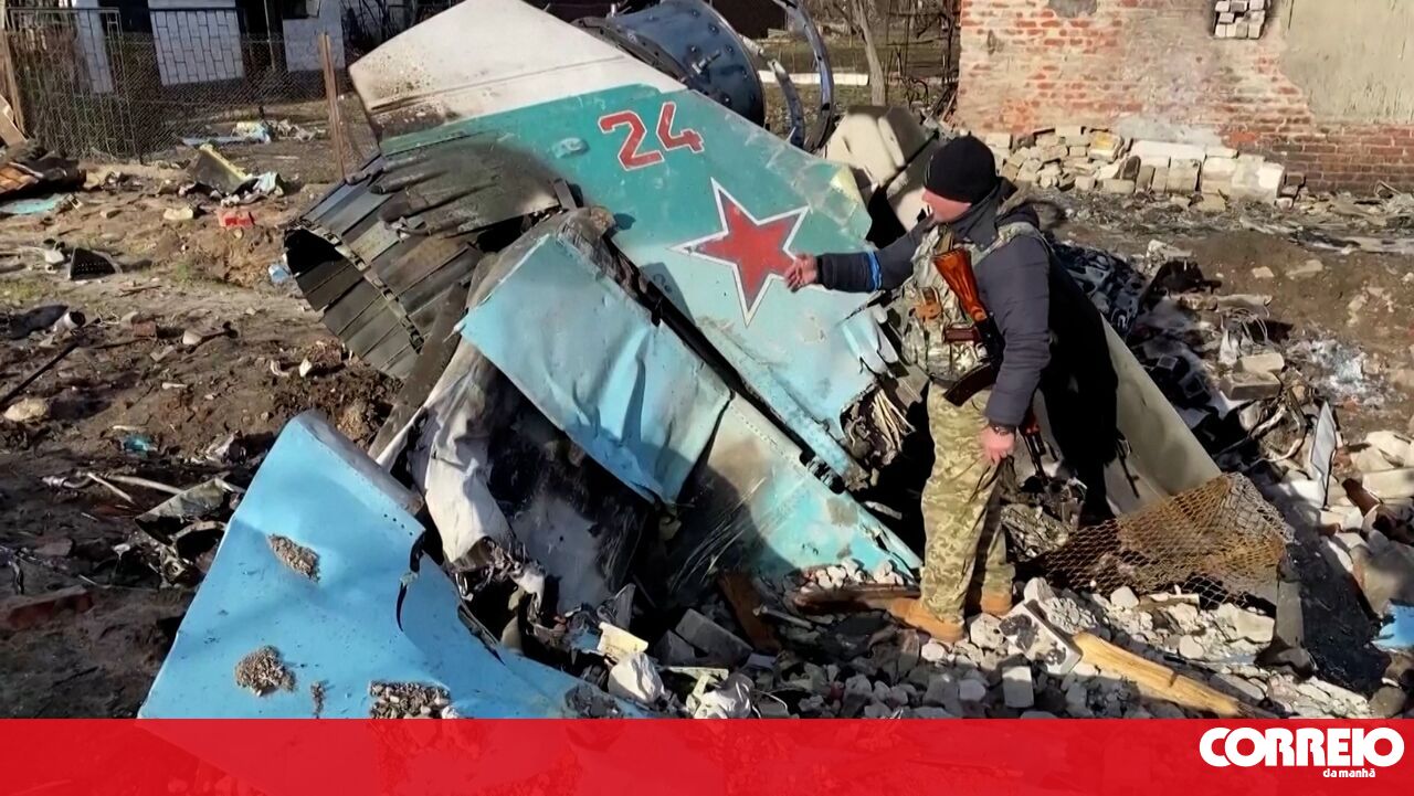 Elementos das forças de defesa ucranianas encontraram, na quarta-feira, um caça russo Sukhoi Su-34 destruído no meio dos escombros numa área residencial em Chernihiv.