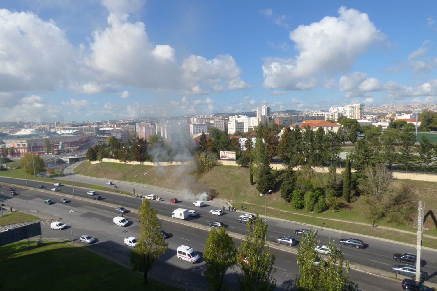 Um carro despistou-se na Segunda Circular em Lisboa, junto à saída para o Centro Comercial Colombo, e começou a arder.