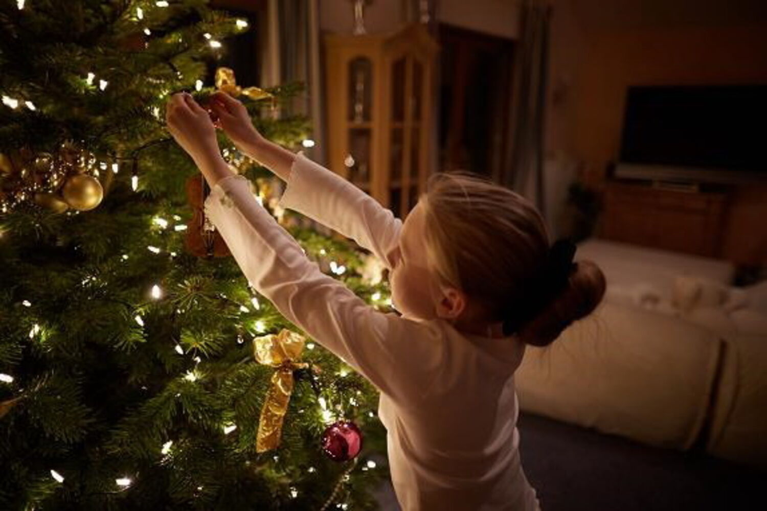 Crie um ambiente acolhedor e confortável – com mantas e almofadas – e não se esqueça de dar um toque natalício também à mesa da ceia de Natal. Coloque um candelabro e verdes no centro da mesa e opte por uma toalha branca e um serviço de loiça com toque dourado para um look clássico. Para uma mesa mais divertida, escolha uma toalha de mesa que se destaque e coloque elementos com desenho típico natalício.