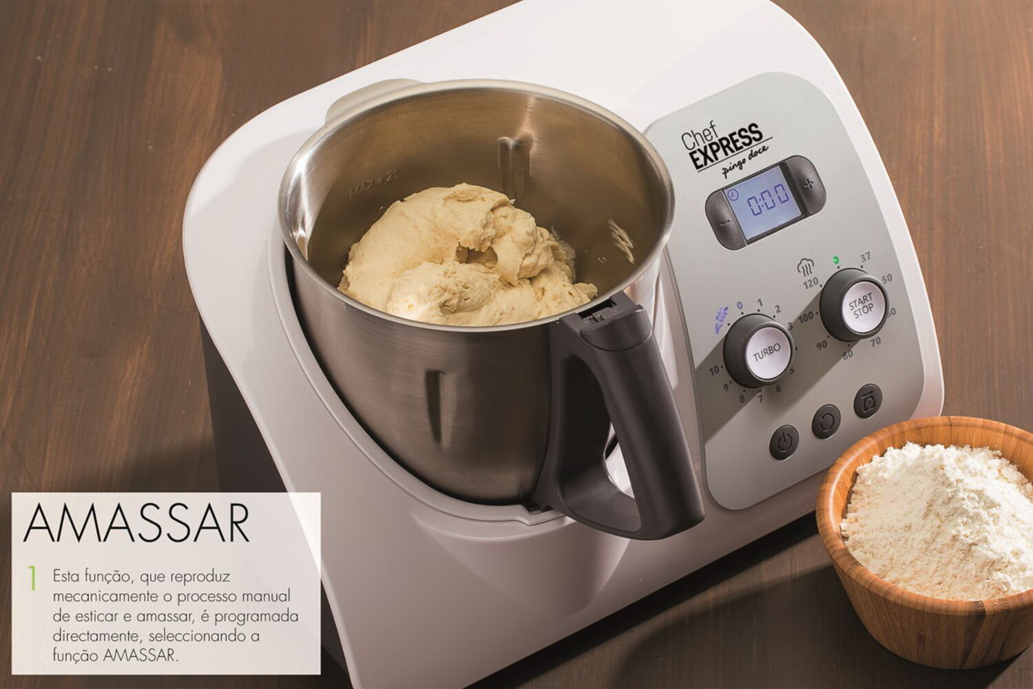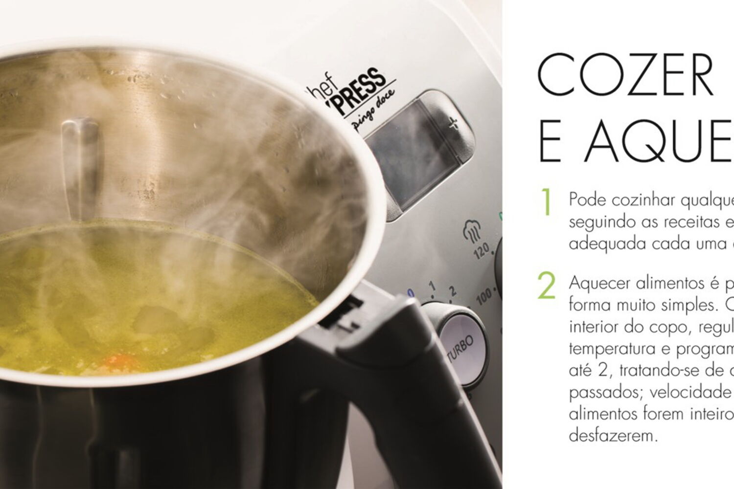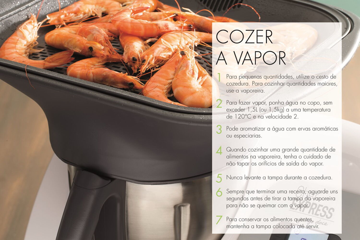 Quem não deseja uma máquina multifunções que substitui praticamente todos os outros eletrodomésticos e põe de lado um conjunto alargado de tachos e panelas? Que pesa, prepara e cozinha os alimentos de forma fácil, rápida e conveniente? Tudo isto sem a necessidade de ter constantemente os olhos postos no fogão. A Chef Express reúne todas as técnicas necessárias para cozinhar: pesa, pica, pulveriza, mexe, amassa, bate, mistura, tritura, emulsiona e coze de diferentes formas, até a vapor. Além disso, vem com um livro com mais de 200 saborosas receitas e com todos os acessórios de que vai precisar.