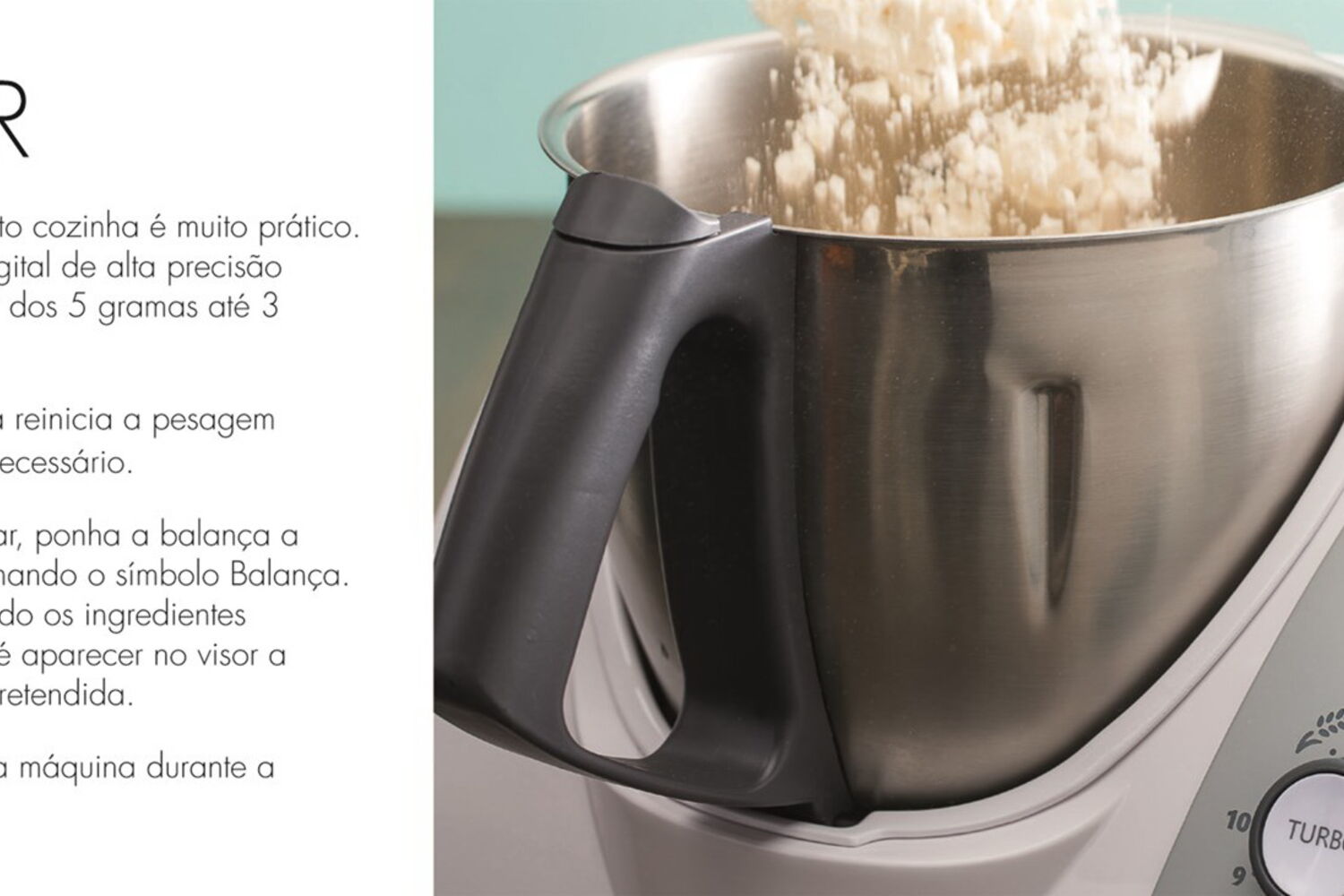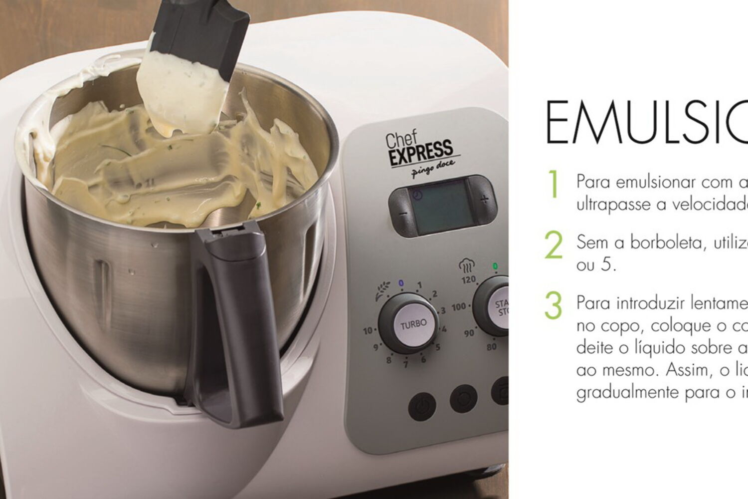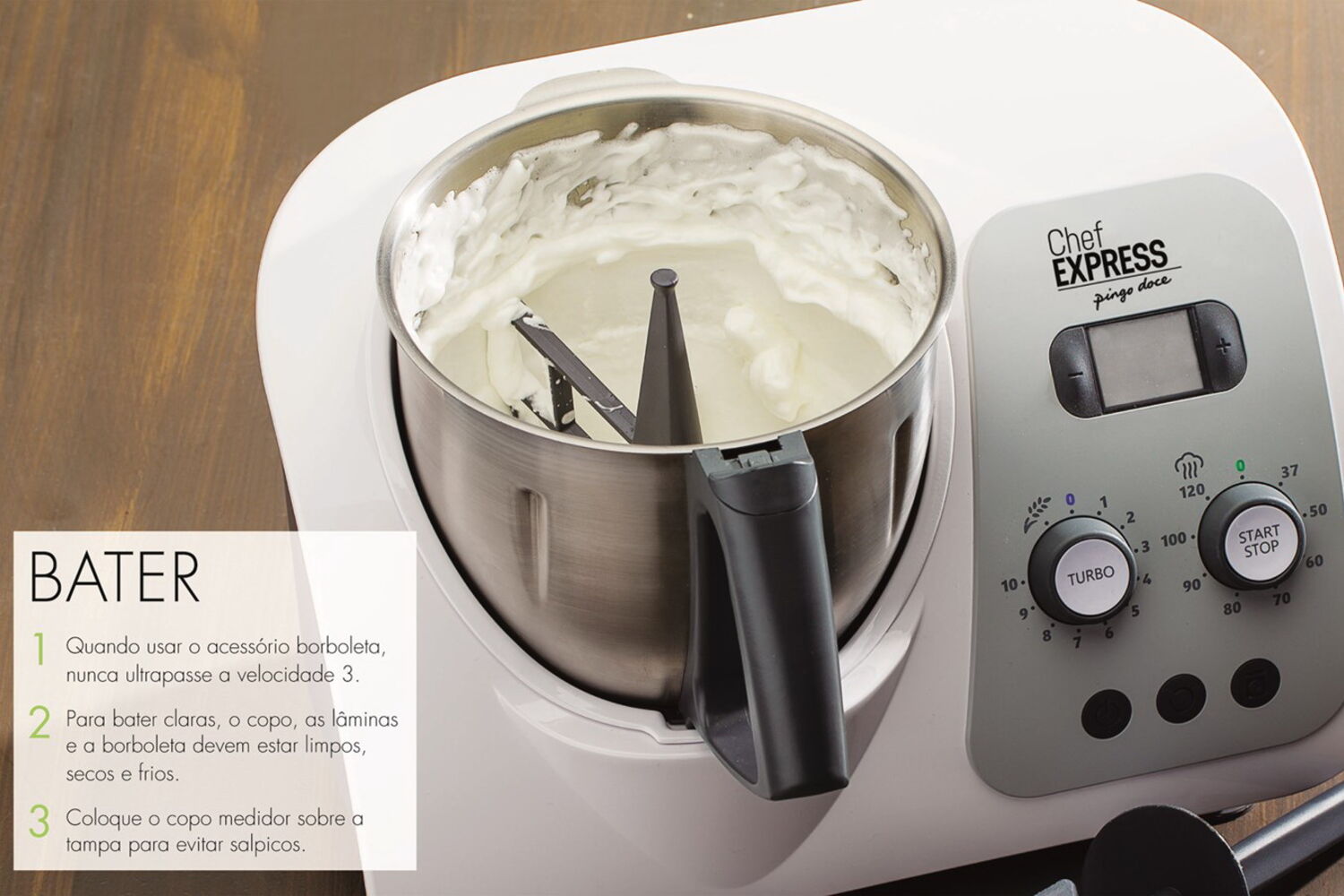 Quem não deseja uma máquina multifunções que substitui praticamente todos os outros eletrodomésticos e põe de lado um conjunto alargado de tachos e panelas? Que pesa, prepara e cozinha os alimentos de forma fácil, rápida e conveniente? Tudo isto sem a necessidade de ter constantemente os olhos postos no fogão. A Chef Express reúne todas as técnicas necessárias para cozinhar: pesa, pica, pulveriza, mexe, amassa, bate, mistura, tritura, emulsiona e coze de diferentes formas, até a vapor. Além disso, vem com um livro com mais de 200 saborosas receitas e com todos os acessórios de que vai precisar.