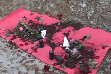 Junto ao cemitério estava uma alcatifa com velas, gatos mortos, galinhas, corações, terra de cemitério e flores.