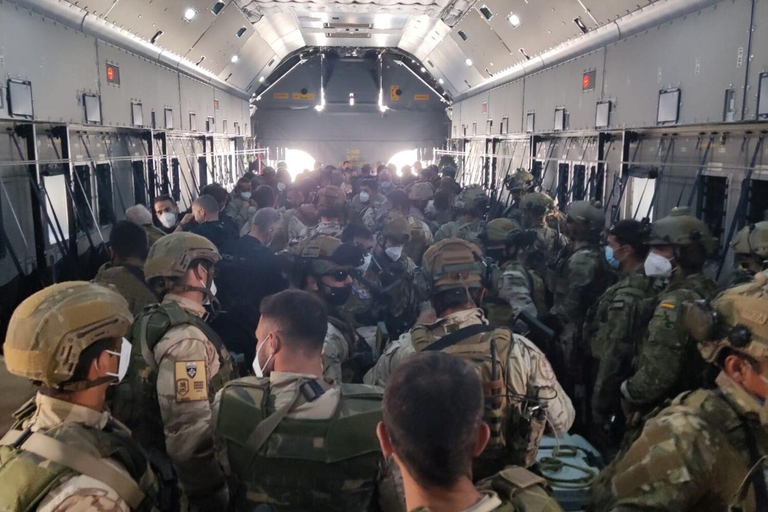 Uma imagem, partilhada pelo site de notícias militar Defense One, mostra centenas de pessoas aglomeradas dentro de um avião militar americano lotado. De acordo com a Reuters, a aeronave tinha como destino o Qatar.