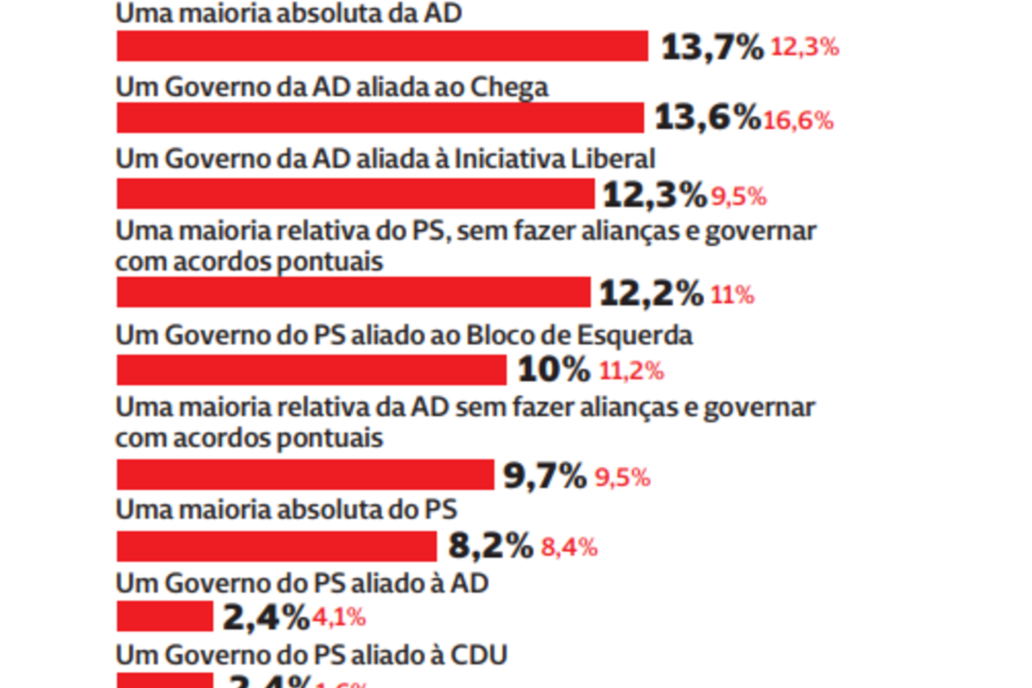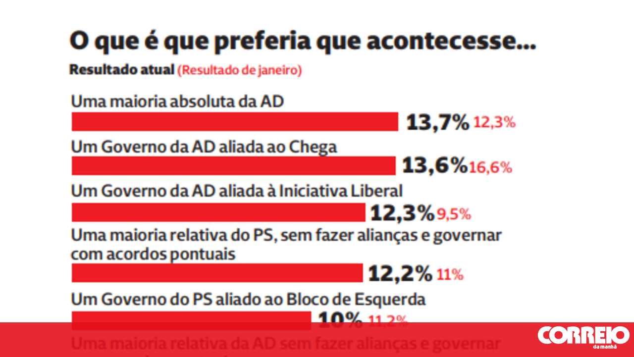Preferência por um Governo de coligação entre a AD e o Chega caiu, em março, para 13,6.
