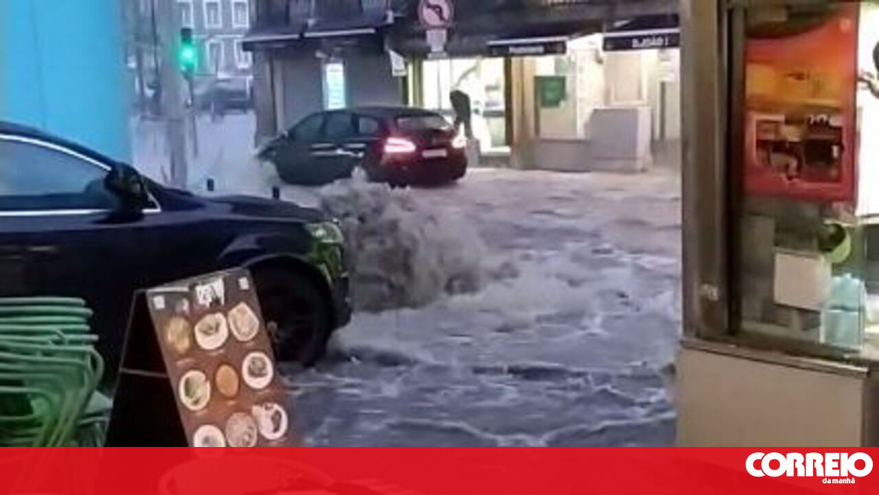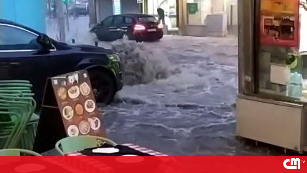 Força da chuva surpreende comerciantes junto à Praça da Figueira em Lisboa