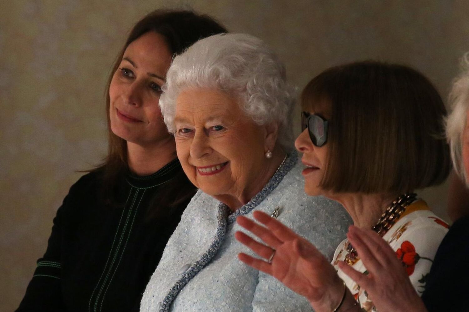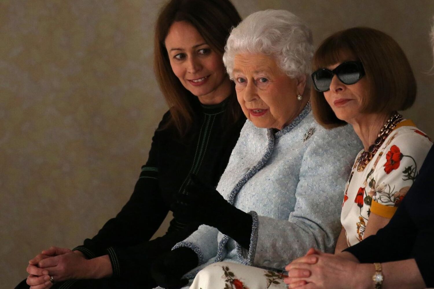 A monarca, de 91 anos, sentou-se ao lado da diretora da edição norte-americana da revista Vogue, Anna Wintour, com a qual conversou de forma informal durante o espetáculo.