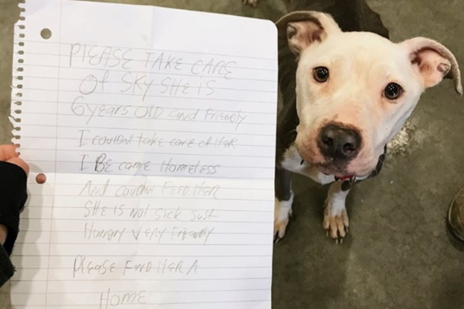 A carta tocante foi publicada posteriormente no Facebook da Associação. "Por favor tomem conta da Sky. Ela tem seis anos e é amigável. Não consigo tomar conta dela porque fiquei sem abrigo e não a consigo alimentar. Ela não está doente, só tem fome. Ela é muito simpática. Por favor encontrem-lhe uma casa. Por favor", escreveu o dono.