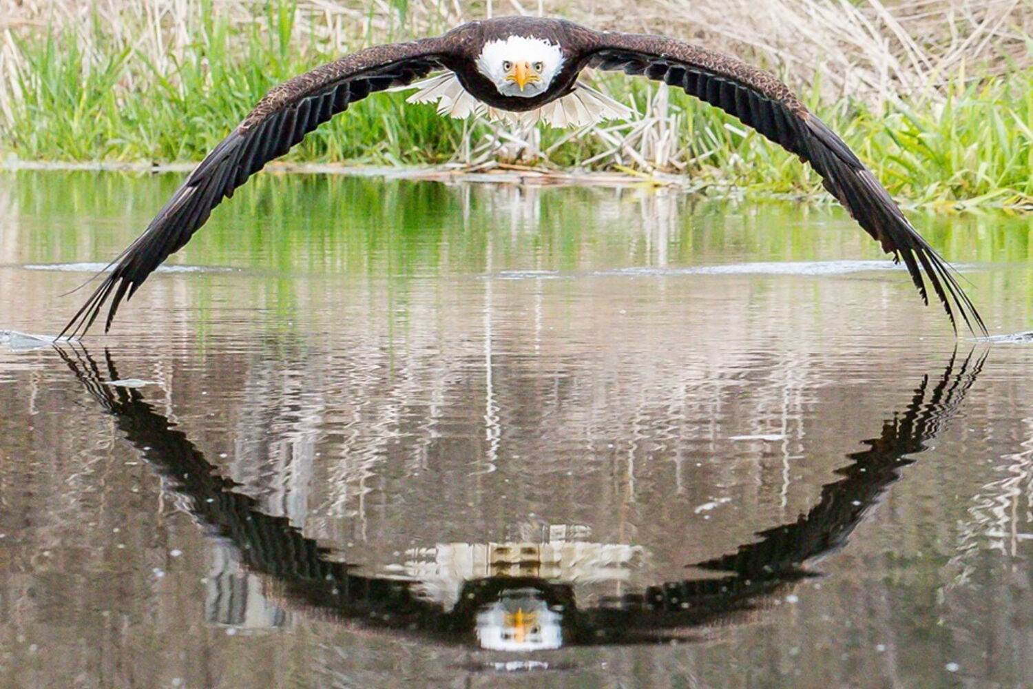 "Tenho várias imagens maravilhosas da visita, mas adorei a simetria desta. A maneira poderosa como a águia está a olhar para mim também me surpreendeu", confessou à BBC. A força da imagem reside, em grande parte, no reflexo do animal da água que cria uma simetria perfeita.