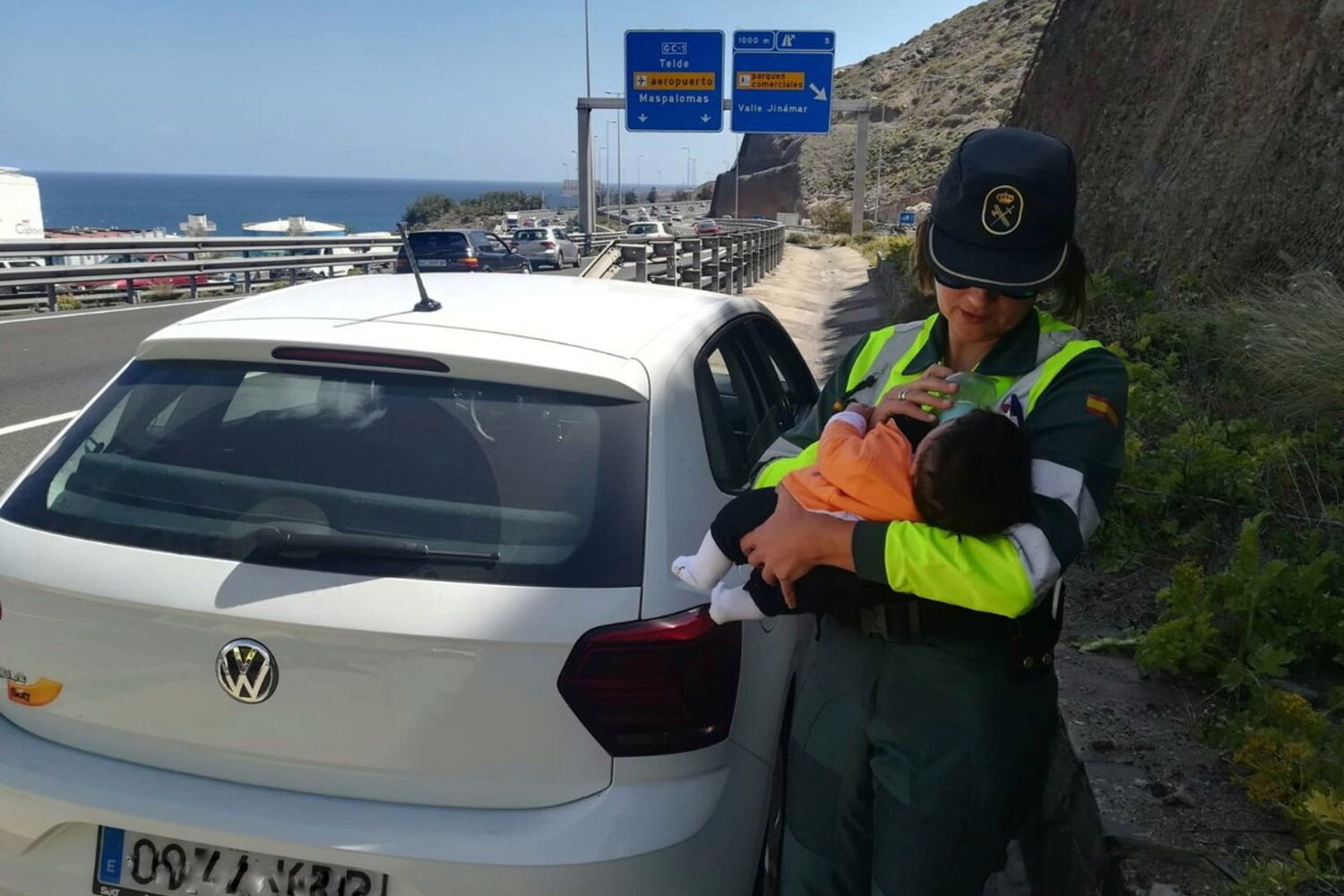A ação "muito peculiar", como a qualifica a Guardia Civil, aconteceu pelas 13h00 de quarta-feira, numa estrada de Las Palmas, na ilha de Gran Canaria. A polícial foi alertada para a situação de emergência pelo número de alerta 112 e tratou de chamar uma ambulância para o pai da criança. Depois, a agente mostrou que a farda não atrapalha de modo nenhum os instintos maternais.
