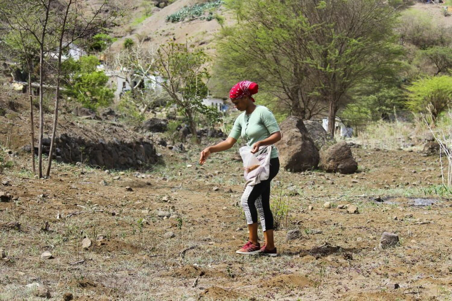 Joana Mendes Varela mora em Achada São Filipe, na cidade da Praia, mas todos os anos leva a família inteira para semear milho e feijões numa parcela de terreno em Órgãos Pequeno, no município de São Lourenço dos Órgãos, no centro da ilha de Santiago.