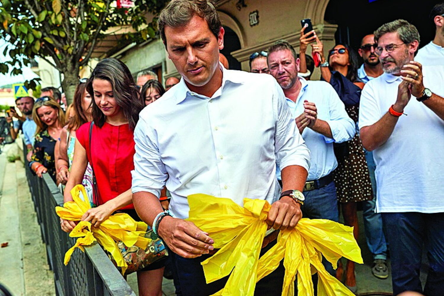 O presidente do Cidadãos, Albert Rivera, e a líder catalã do partido, Inés Arrimadas, entraram na querela dos laços amarelos que inundam espaços públicos na Catalunha e participaram esta quarta-feira em Alella, Barcelona, numa retirada dos símbolos de apoio aos separatistas detidos.