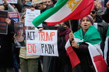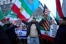 O grupo entoava cânticos em italiano e inglês, agitando bandeiras iranianas ao lado de bandeiras americanas e israelitas. "Obama observou, Biden falou, você pode agir", foi uma das mensagens dirigidas ao presidente dos EUA.