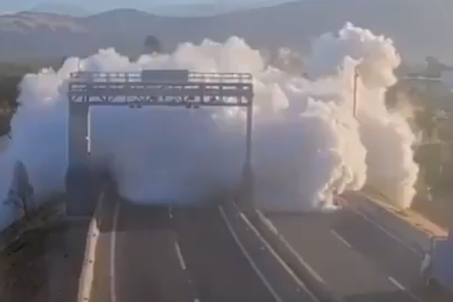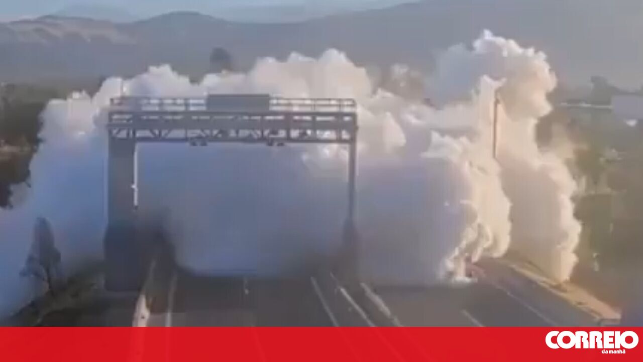 As imagens que mostram o momento da explosão são impressionantes, com uma enorme nuvem de fumo branco.