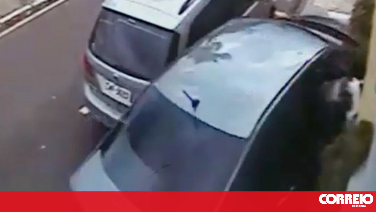 O animal acaba por cair na calçada e foge, assustado, para a porta do cabeleireiro, onde foi acolhido, por uma profissional.