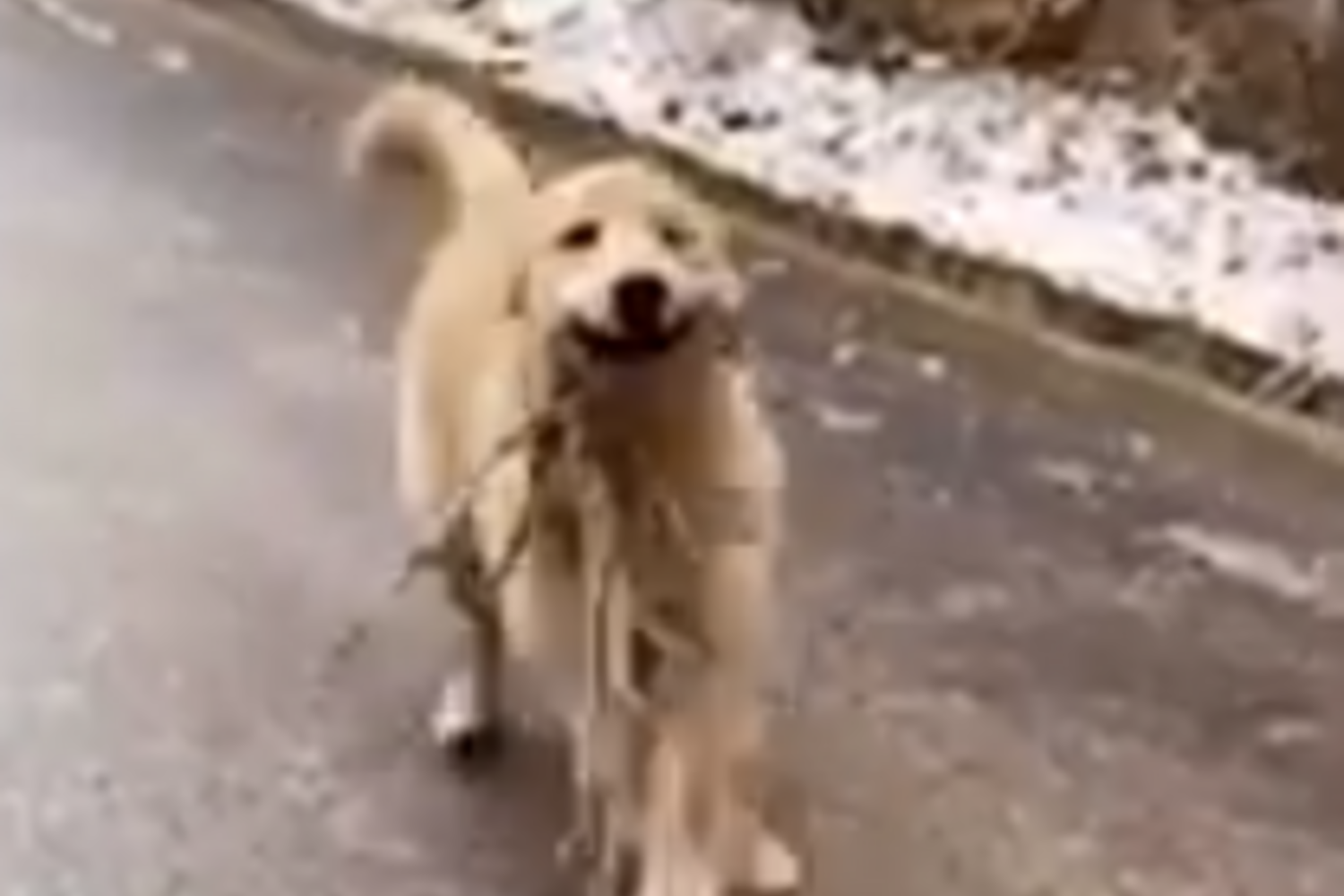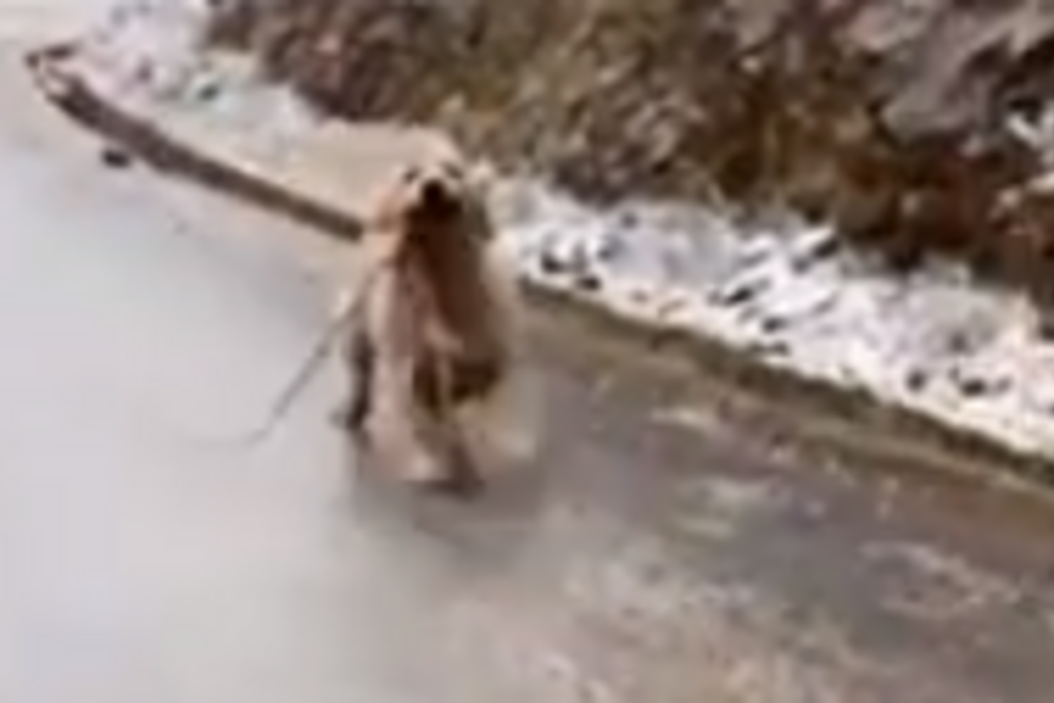 Bolo é um Golden Retriever de oito meses e foi filmado a correr, meio trapalhão, em direção ao dono, antes de deslizar na estrada uma vez que esta estava com geada.