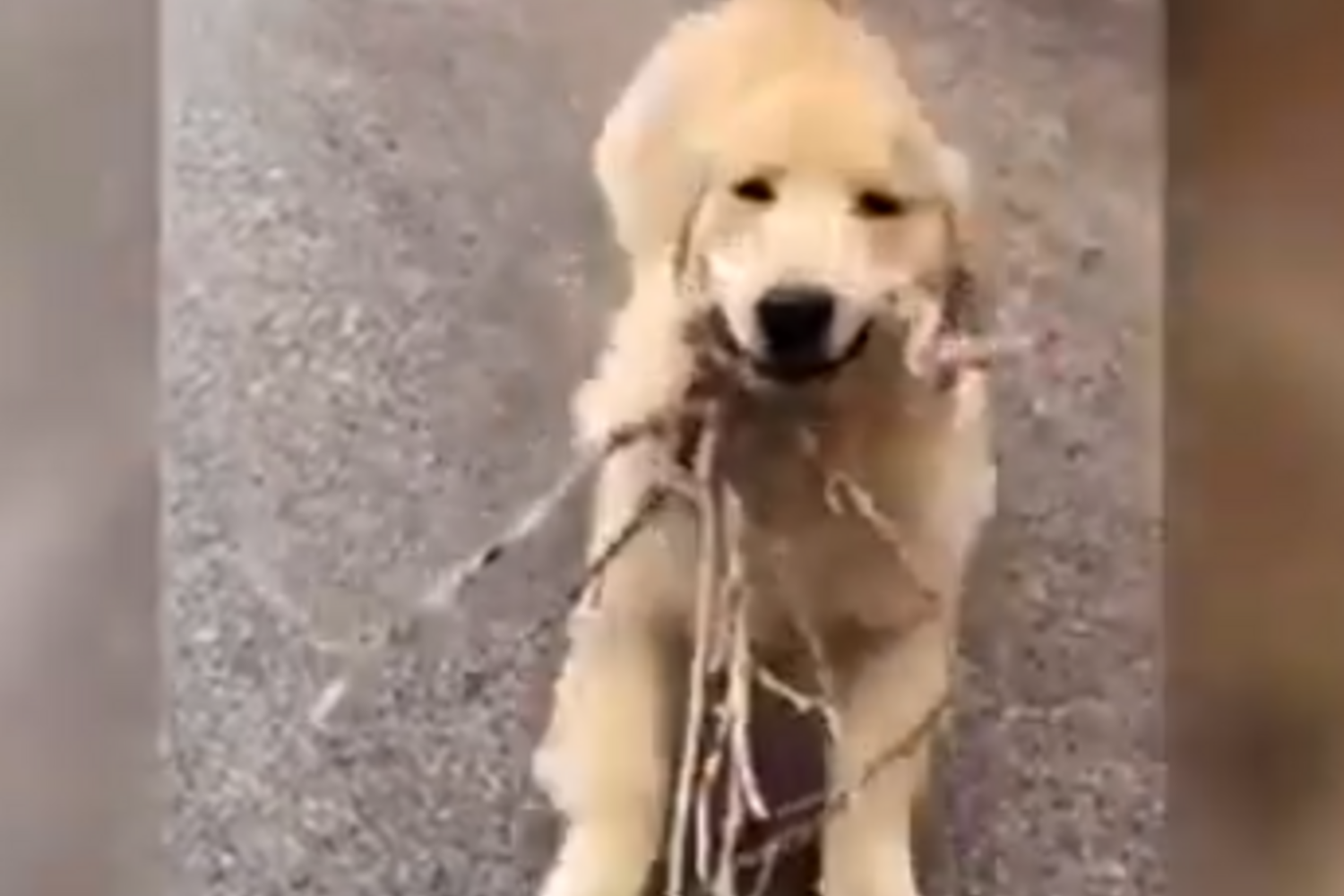 Um cão de estimação não conseguiu conter a emoção após encontrar um conjunto de ramos de árvore, na China, como forma de presentear o dono.