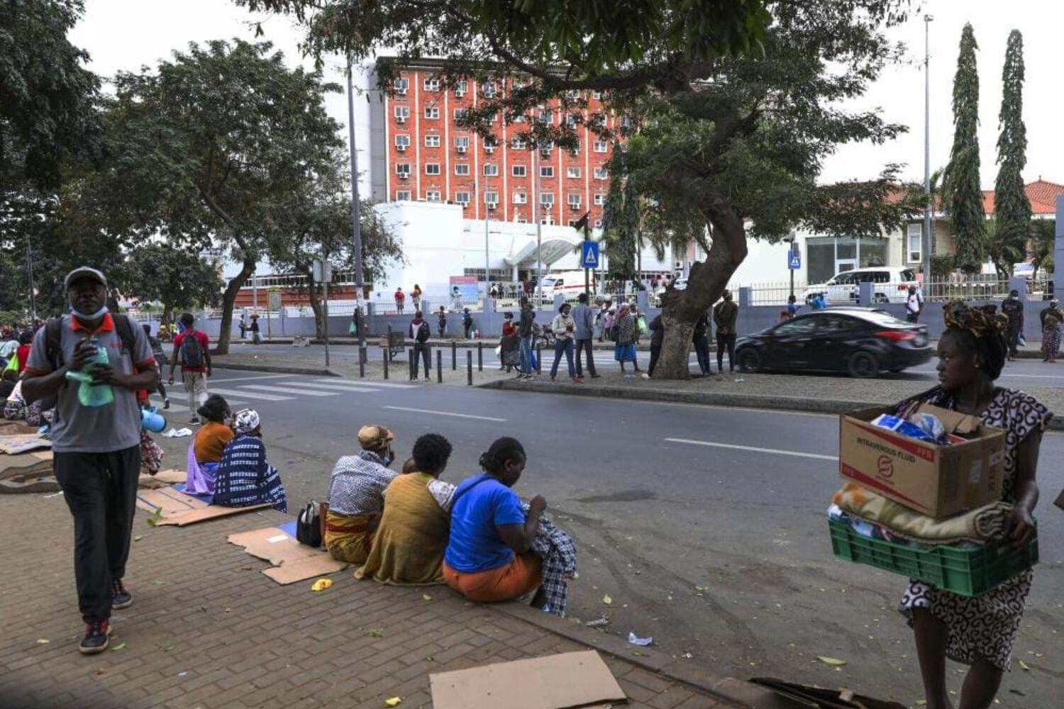 Também ali há cartões ou "luandos" (esteiras) estendidos para a pernoita, vendedores ambulantes e familiares que circulam enquanto aguardam informações sobre pacientes.